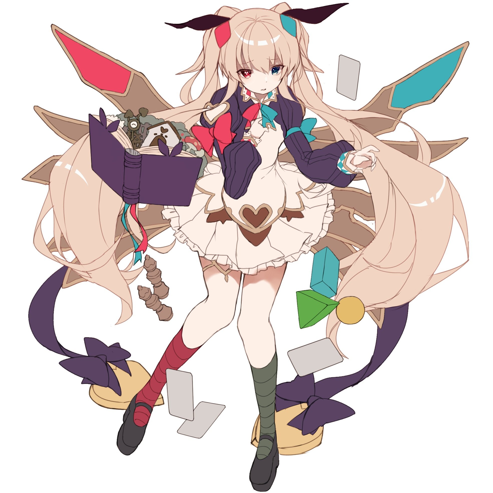 1girl alice_undertale_(grimms_notes) asymmetrical_legwear az_9649 blonde_hair blue_eyes book chaos_alice_(grimms_notes) full_body grimms_notes hair_between_eyes hair_ornament heterochromia highres long_hair long_sleeves looking_at_viewer mismatched_legwear open_book parted_lips puffy_long_sleeves puffy_sleeves purple_sleeves red_eyes simple_background skirt solo twintails very_long_hair white_background white_skirt