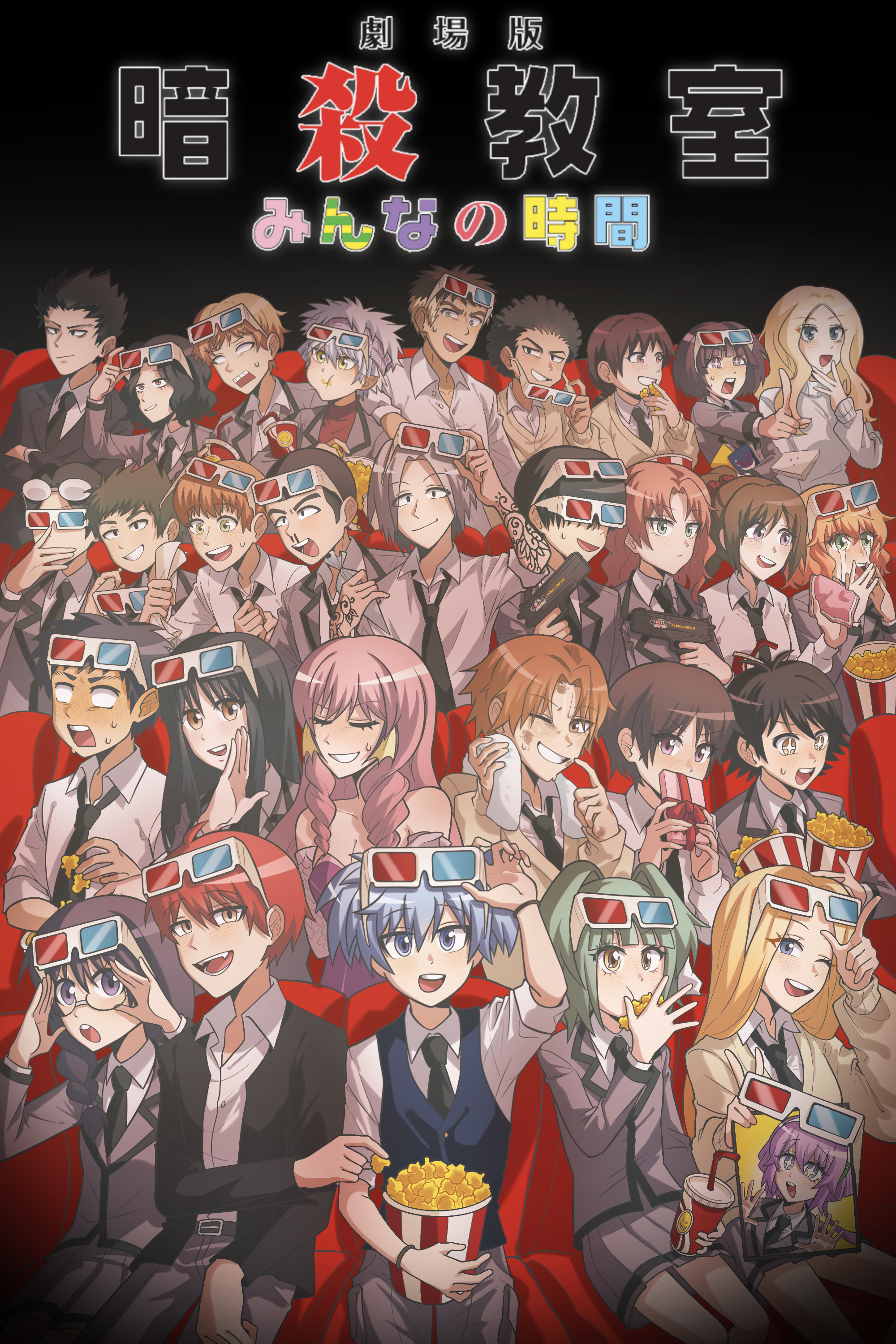 3d_glasses 6+boys 6+girls absurdres akabane_karma ansatsu_kyoushitsu arm_tattoo black_hair black_necktie blonde_hair blood blue_eyes blue_hair blue_vest braid breasts brown_hair chiba_ryuunosuke cleavage collared_shirt commentary cup disposable_cup everyone fins food fuwa_yuzuki glasses green_hair grey_hair gun handgun hara_sumire hayami_rinka hazama_kirara head_fins highres holding holding_gun holding_weapon horibe_itona irina_jelavic isogai_yuuma jiritsu_shikou_kotei_houdai kanzaki_yukiko karasuma_tadaomi kataoka_megu kayano_kaede kimura_masayoshi kunugigaoka_middle_school_uniform kurahashi_hinano m_uramatsu_takuya maehara_hiroto mimura_kouki movie_theater multiple_boys multiple_girls muramatsu_takuya nakamura_rio necktie nosebleed okajima_taiga okano_hinata_(ansatsu_kyoushitsu) okuda_manami one_eye_closed open_mouth pink_hair popcorn purple_eyes red_hair school_uniform shiota_nagisa shirt sitting skirt smile sugaya_sousuke sugino_tomohito takebayashi_koutarou tattoo tears terasaka_ryouma translation_request twin_braids vest weapon yada_touka yoshida_taisei
