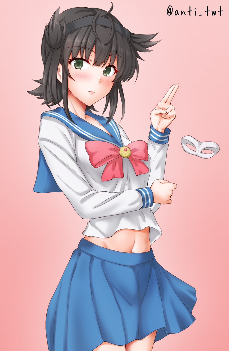 1girl anti_(untea9) bishoujo_senshi_sailor_moon bishoujo_senshi_sailor_moon_s black_hair blue_sailor_collar blush bow breasts brown_hair gradient_background hair_flaps hairband hatsuzuki_(kancolle) headband highres juuban_middle_school_uniform kantai_collection long_hair looking_at_viewer pink_background red_bow sailor_collar school_uniform serafuku short_hair skirt solo twitter_username