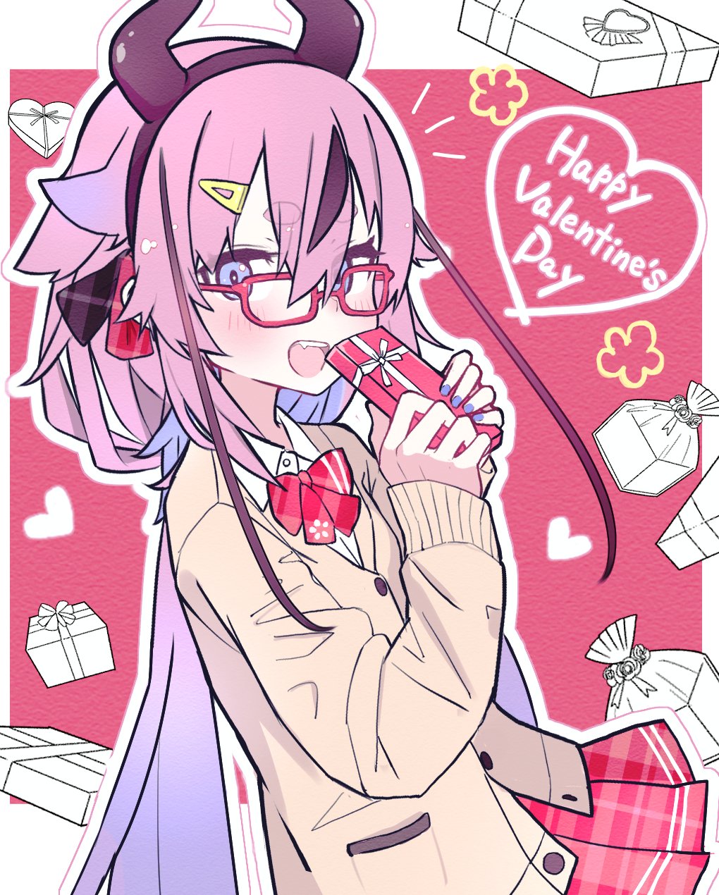 1other :d alternate_costume black_horns blue_eyes blue_hair blue_nails blush border bow bowtie box brown_cardigan brown_streaks cardigan collared_shirt colored_inner_hair commentary fake_horns fang gift gift_box glasses gradient_hair gynoid_talk hair_between_eyes hair_flaps hair_ornament hairband hairclip happy_valentine heart highres holding holding_box holding_gift horn_hairband horns long_hair long_sleeves looking_at_viewer low_twintails meika_hime meika_hime_(gynoid_talk) multicolored_hair nail_polish notice_lines open_mouth outline outside_border pink_hair plaid_bow plaid_clothes plaid_skirt red-framed_eyewear red_background red_bow red_bowtie red_nails red_skirt school_uniform shirt short_eyebrows skirt smile solo streaked_hair sukenoota teeth twintails upper_teeth_only valentine vocaloid white_border white_outline white_shirt