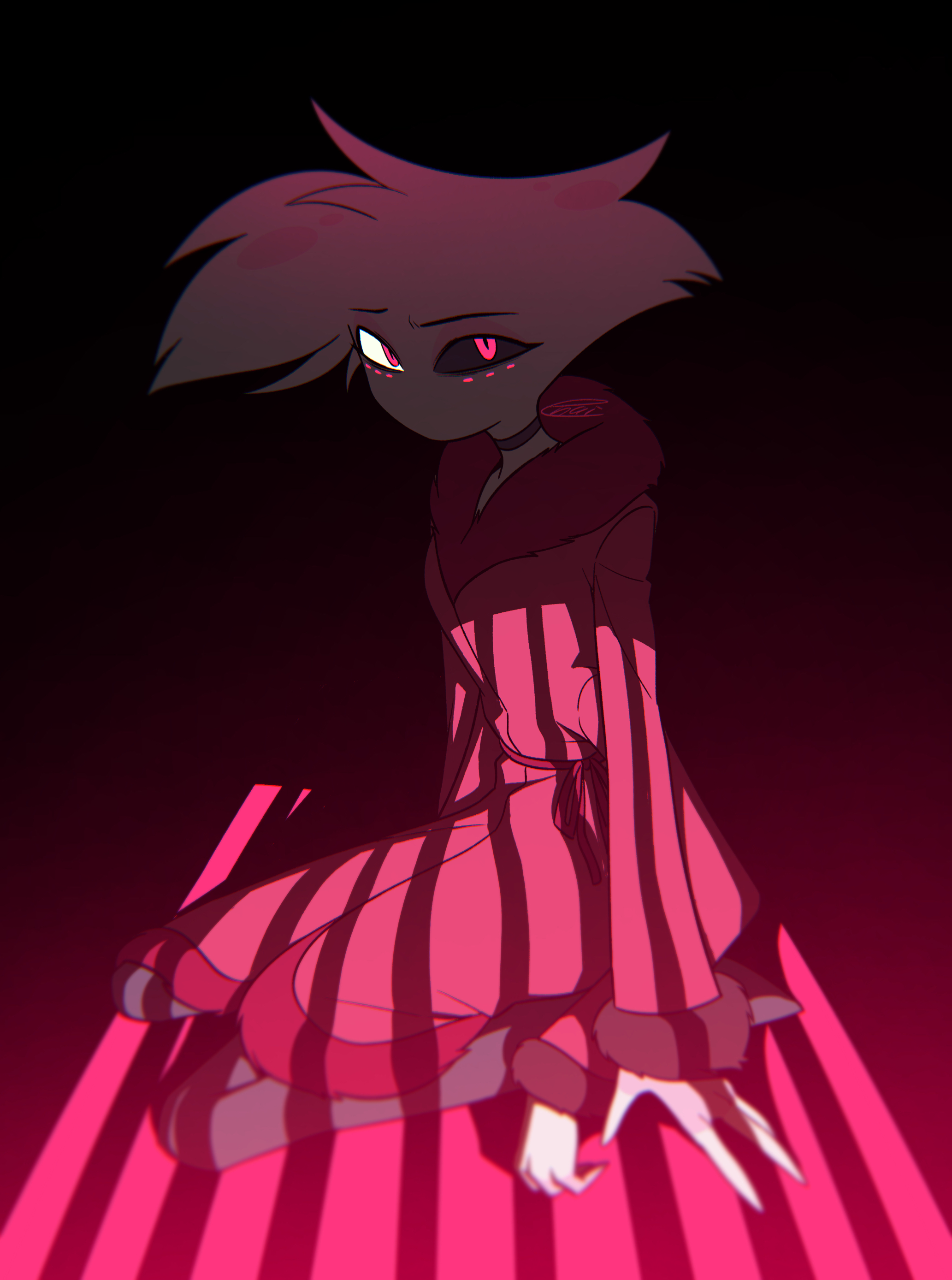 1boy absurdres angel_dust arm_support black_boots black_choker black_sclera blurry boots choker chromatic_aberration colored_sclera commentary_request dappled_sunlight depth_of_field extra_arms facial_mark fewer_digits from_above full_body fur-trimmed_robe fur-trimmed_sleeves fur_trim furrowed_brow furry furry_male glowing glowing_eyes hazbin_hotel hellaverse highres long_sleeves looking_at_viewer male_focus menma_(enaic31) mismatched_sclera no_mouth no_nose official_alternate_costume pink_eyes red_background red_robe robe signature simple_background sitting solo sunlight wariza white_fur
