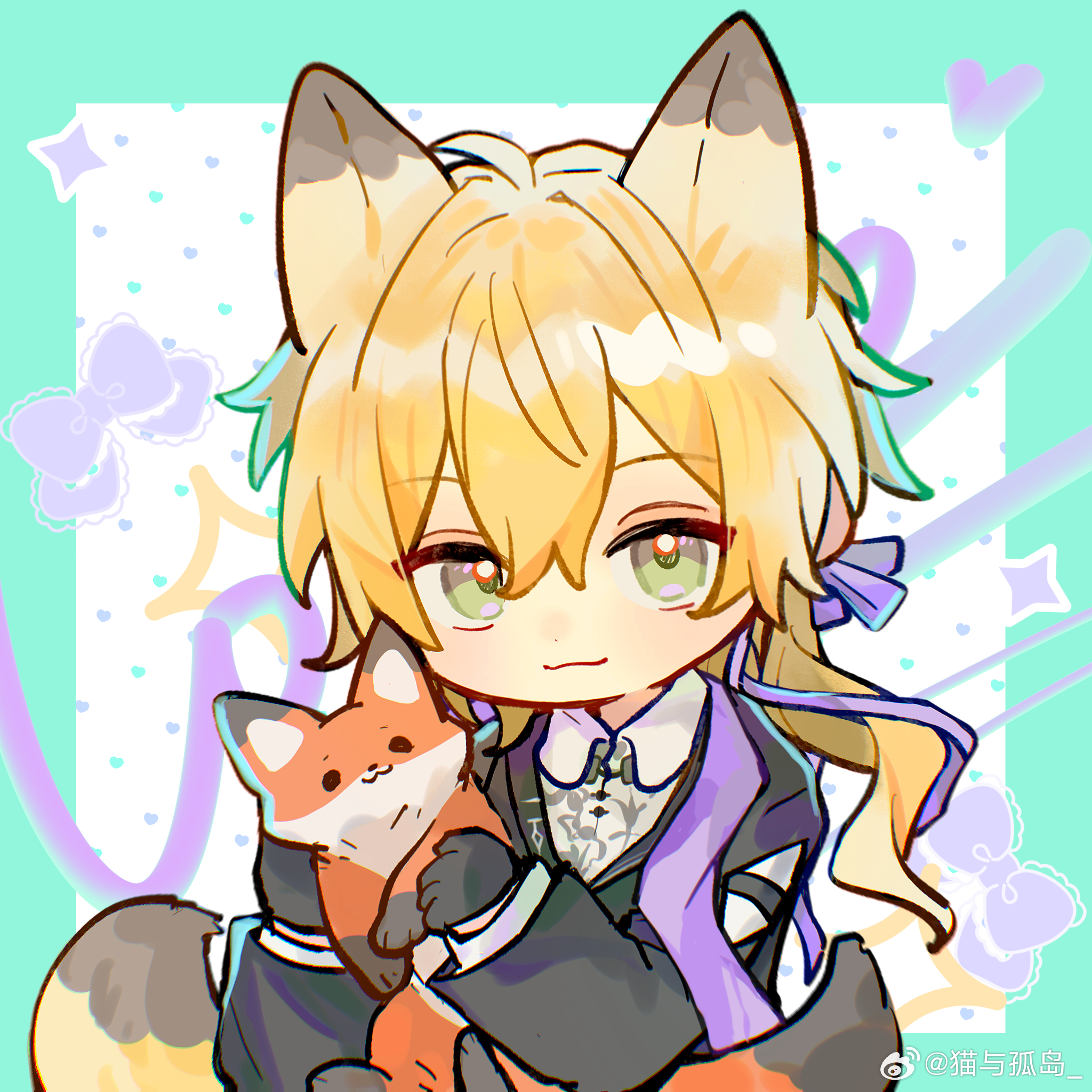 1boy :3 alkaid_mcgrath animal animal_ears black_gloves black_jacket blonde_hair border bow character_name chinese_commentary closed_mouth collared_shirt commentary_request deformed fox fox_boy fox_ears fox_tail gloves green_border green_eyes hair_between_eyes hair_ribbon heart heart_background highres holding holding_animal jacket kemonomimi_mode long_hair long_sleeves looking_at_viewer lovebrush_chronicles low_ponytail male_focus maoyu_gudao_falling outside_border ponytail purple_bow purple_ribbon ribbon shirt smile solo sparkle tail upper_body watermark weibo_watermark white_background white_shirt