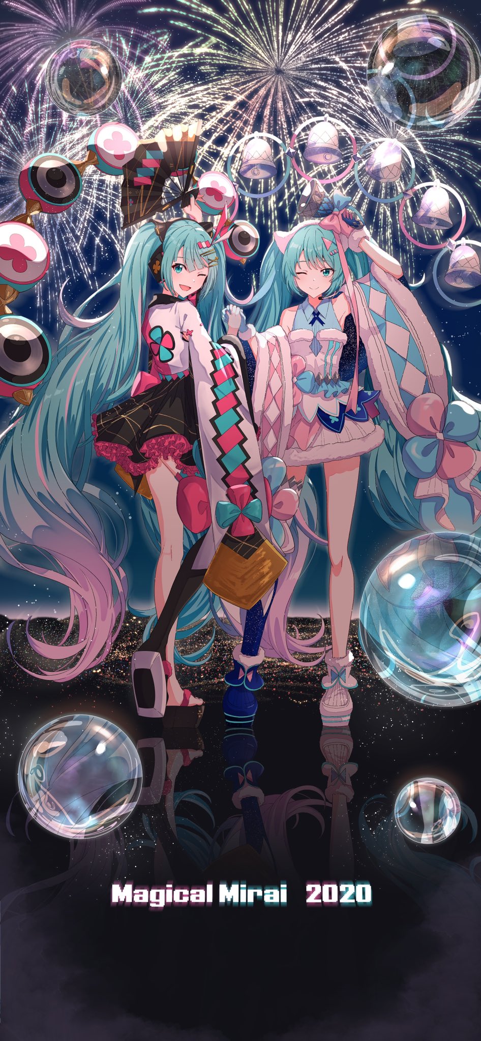 2girls aerial_fireworks aqua_eyes aqua_hair arm_up asymmetrical_legwear asymmetrical_sleeves bare_shoulders bell black_choker black_skirt black_thighhighs blue_bow blue_eyes blue_gloves blue_hair blush border bow cherry_blossom_print choker closed_mouth collared_dress commentary_request detached_sleeves dress drum dual_persona fireworks floral_print flower frilled_skirt frills full_body fur-trimmed_dress fur_trim furisode_sleeves gloves hair_between_eyes hair_bow hair_ornament hairclip handbell hatsune_miku headphones highres holding_hands instrument itogari japanese_clothes kimono legs long_hair long_sleeves looking_at_viewer magical_mirai_(vocaloid) magical_mirai_miku magical_mirai_miku_(2020_summer) magical_mirai_miku_(2020_winter) miniskirt mismatched_sleeves multiple_girls multiple_views official_alternate_costume one_eye_closed open_mouth parted_lips pink_bow pink_frills pink_sleeves pleated_skirt sandals sidelocks single_thighhigh skirt sleeveless sleeveless_dress smile snow_boots speaker striped_clothes striped_kimono striped_skirt thighhighs thighs twintails two-tone_bow very_long_hair vocaloid waistband white_dress white_kimono white_sleeves white_wrist_cuffs wide_sleeves wrist_cuffs yukata