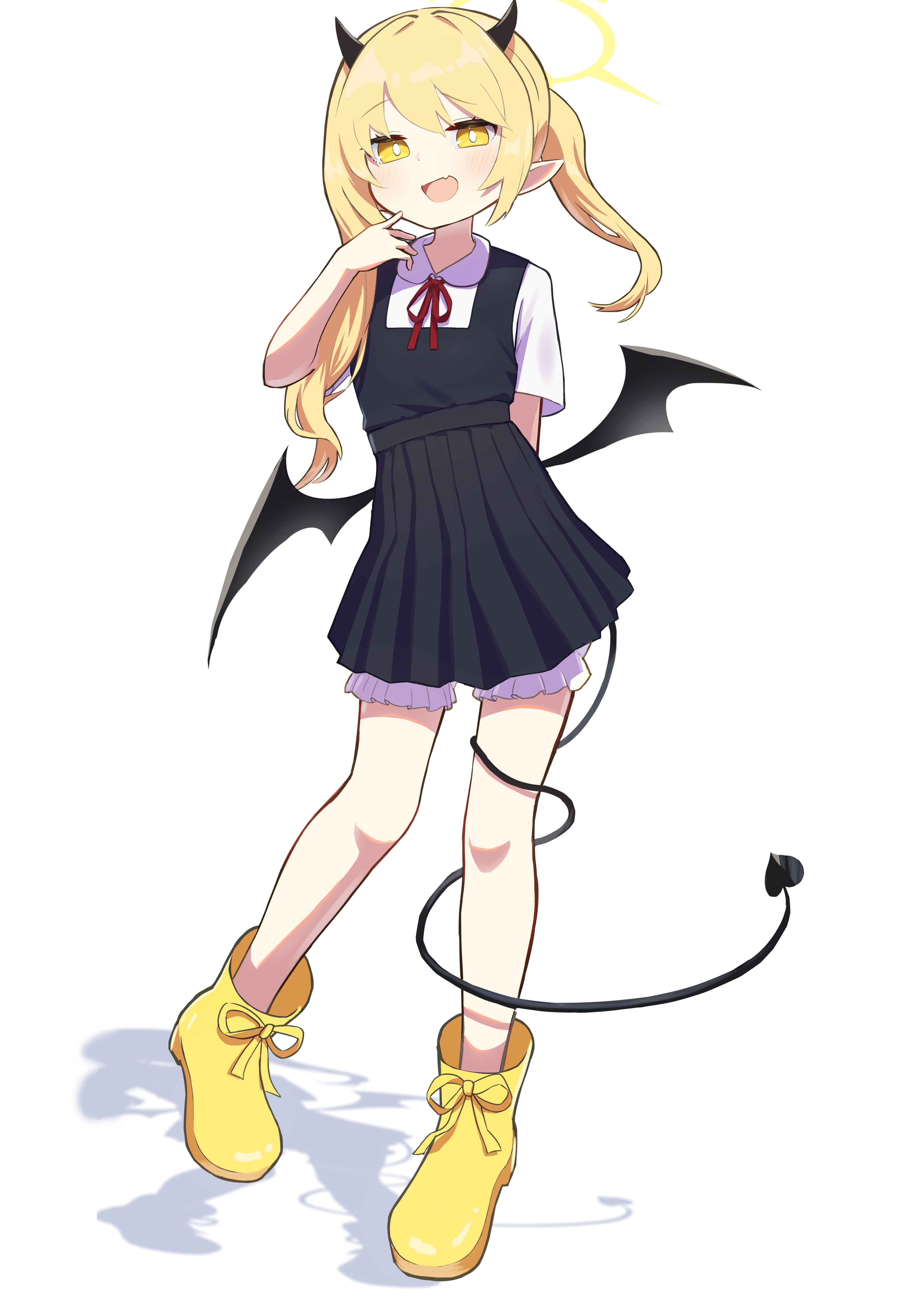 1girl :d absurdres arm_behind_back asymmetrical_hair black_dress black_horns black_wings blonde_hair bloomers blue_archive blush boots bright_pupils collared_shirt commentary demon_girl demon_tail demon_wings dress fang finger_to_cheek full_body halo hand_up highres horns ibuki_(blue_archive) kubo-den long_hair looking_at_viewer low_wings neck_ribbon open_mouth pigeon-toed pinafore_dress pointy_ears red_ribbon ribbon rubber_boots shadow shirt short_sleeves side_ponytail simple_background single_sidelock skin_fang sleeveless sleeveless_dress smile solo standing tail tail_around_own_leg underwear white_background white_bloomers white_pupils white_shirt wings yellow_boots yellow_eyes yellow_halo