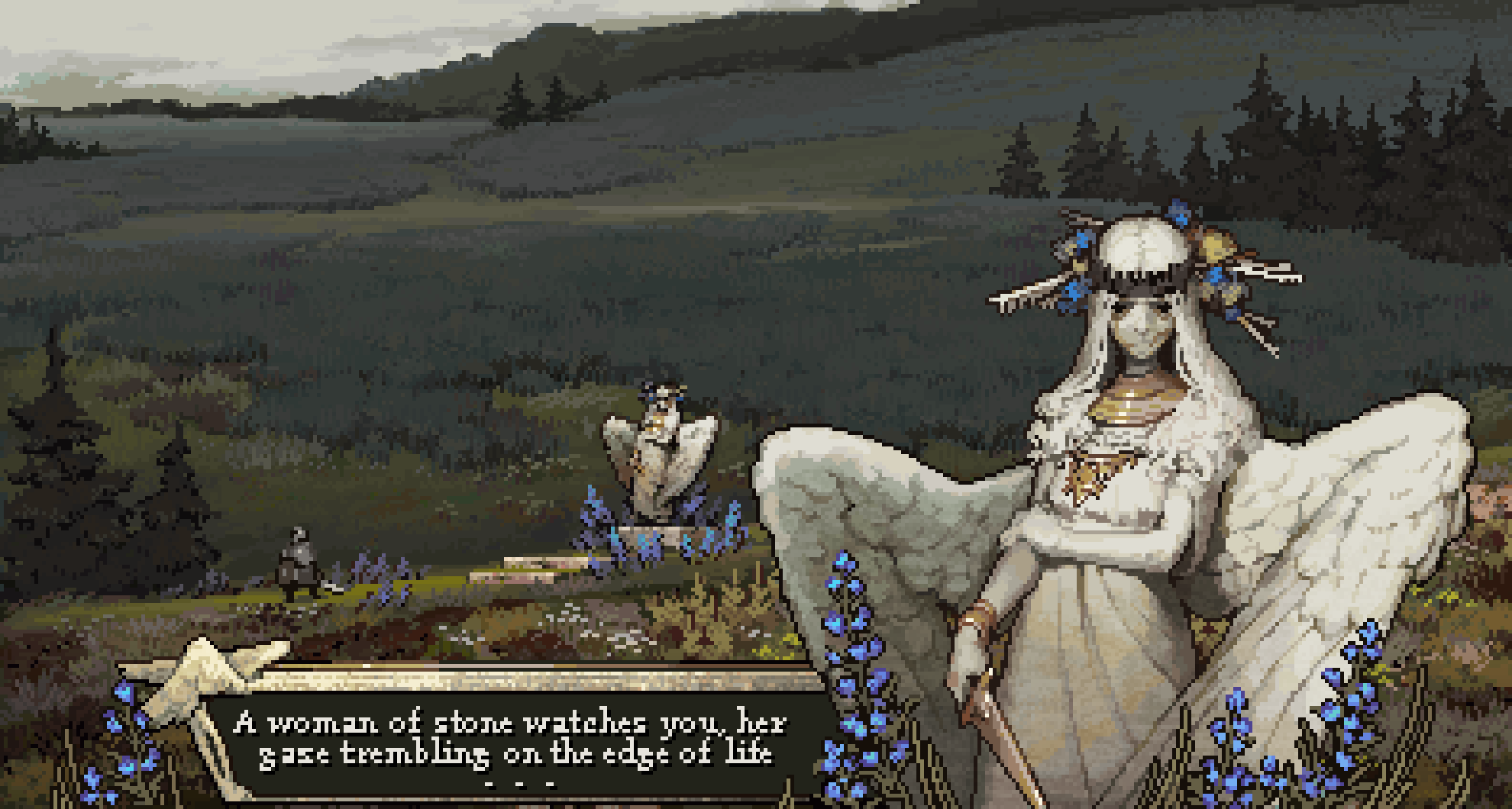1girl 1other angel_wings black_hairband blue_flower colored_skin commentary echerry english_commentary english_text field flower grey_skin hairband highres holding holding_weapon long_hair original outdoors pixel_art tree video_game_dialogue_box weapon white_hair white_wings wings