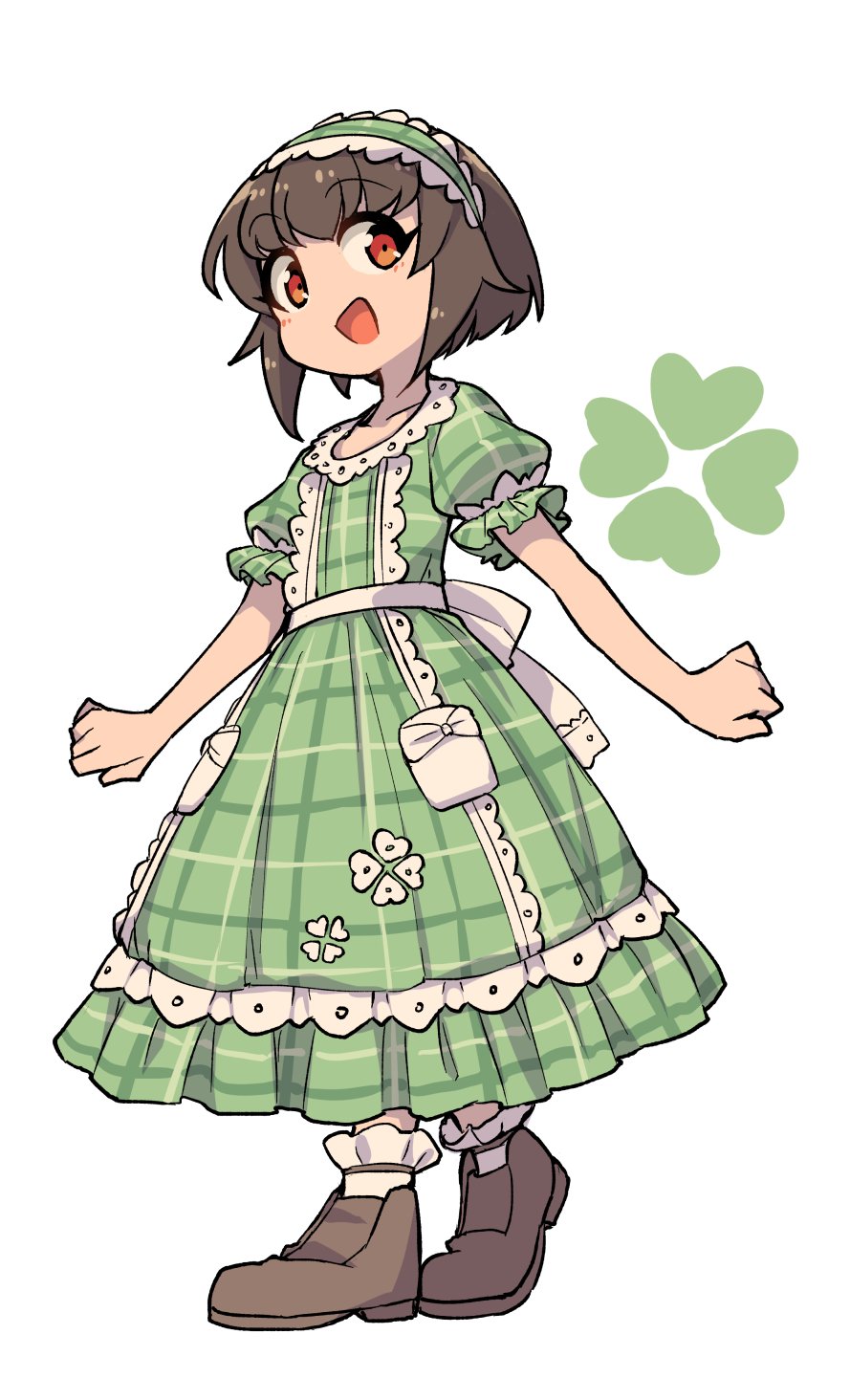 1boy :d ayumu_(fun_bo) brown_hair brown_shoes clover commentary crossdressing crossdressing_(mtf) dress fashion four-leaf_clover frilled_dress frills fun_bo green_dress green_hair hair_flaps hairband highres long_dress looking_at_viewer male_focus open_mouth original plaid_clothes plaid_dress plaid_hairband puffy_short_sleeves puffy_sleeves red_eyes shoes short_hair short_sleeves simple_background smile socks solo standing white_background white_socks
