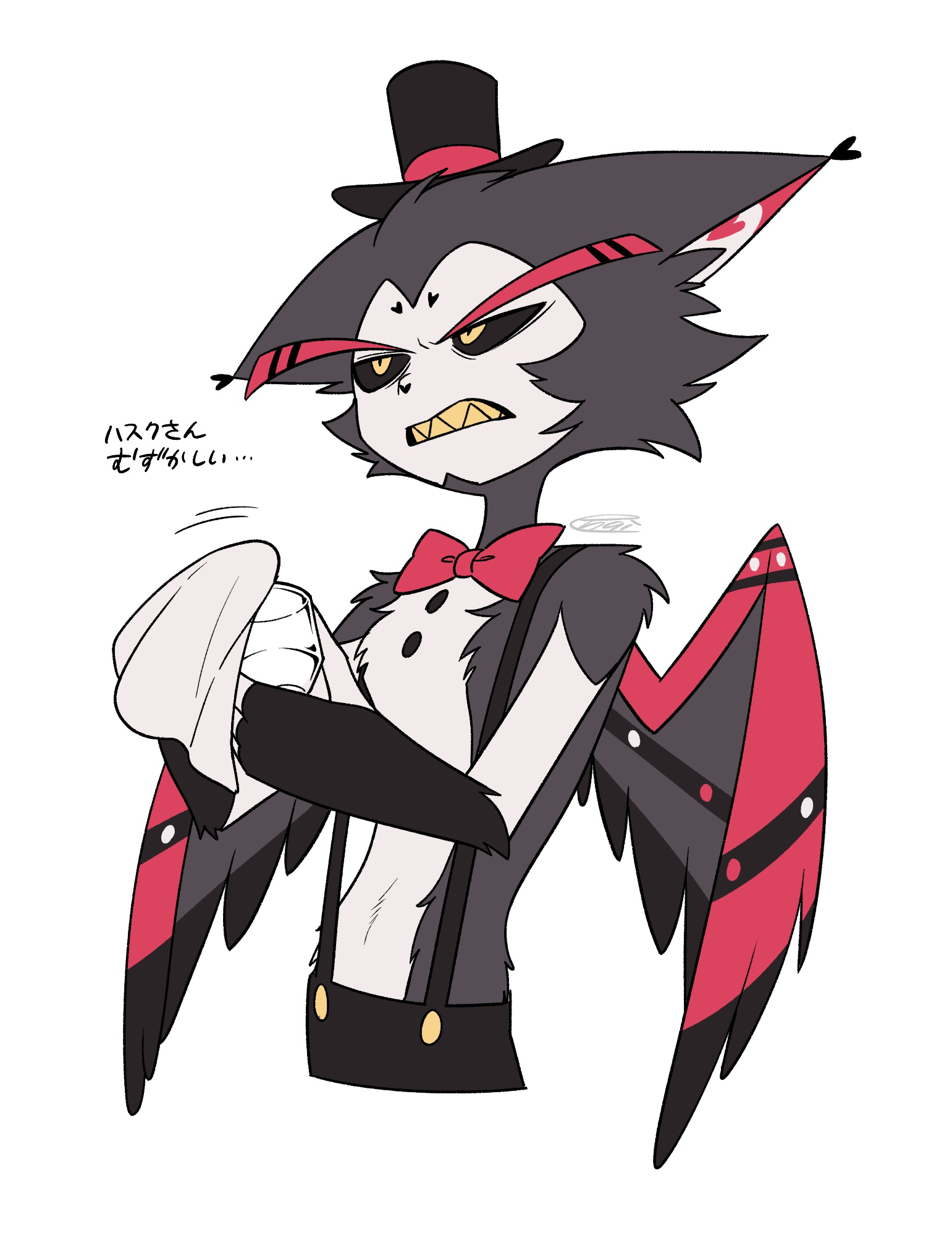 1boy angry black_fur black_gloves black_hat black_pants black_sclera black_wings bow bowtie buttons cat_boy cleaning clenched_teeth colored_sclera colored_teeth commentary_request cropped_torso cup elbow_gloves feathered_wings fewer_digits fingerless_gloves flat_color from_below furry furry_male glass gloves hands_up hat hazbin_hotel heart hellaverse highres holding holding_cup holding_towel husk_(hazbin_hotel) jitome looking_ahead male_focus menma_(enaic31) mini_hat mini_top_hat pants red_bow red_bowtie red_wings sharp_teeth signature simple_background solo standing suspenders teeth top_hat topless_male towel traditional_bowtie translation_request two-tone_fur white_background white_fur wings yellow_eyes yellow_teeth