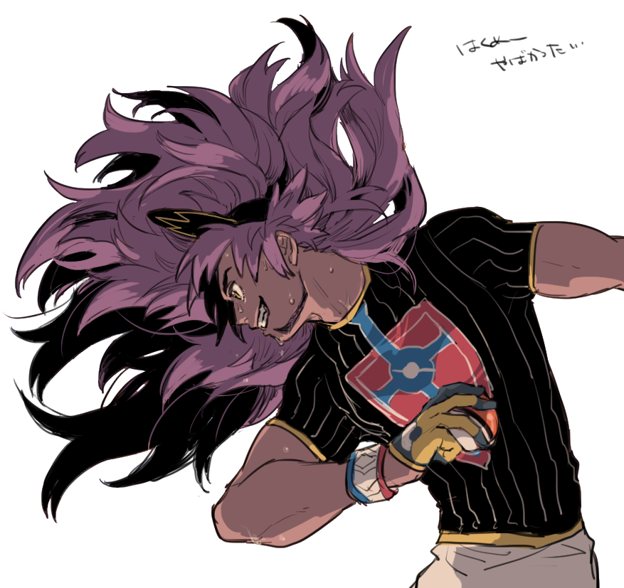 1boy baseball_cap black_hat black_shirt champion_uniform chuu_ni commentary_request dark-skinned_male dark_skin dynamax_band facial_hair floating_hair gloves grin hat holding holding_poke_ball leon_(pokemon) long_hair male_focus multicolored_gloves nintendo pants pinstripe_pattern pinstripe_shirt poke_ball poke_ball_(basic) pokemon pokemon_sword_and_shield print_shirt profile purple_hair shirt short_sleeves smile solo translation_request white_background white_pants yellow_eyes