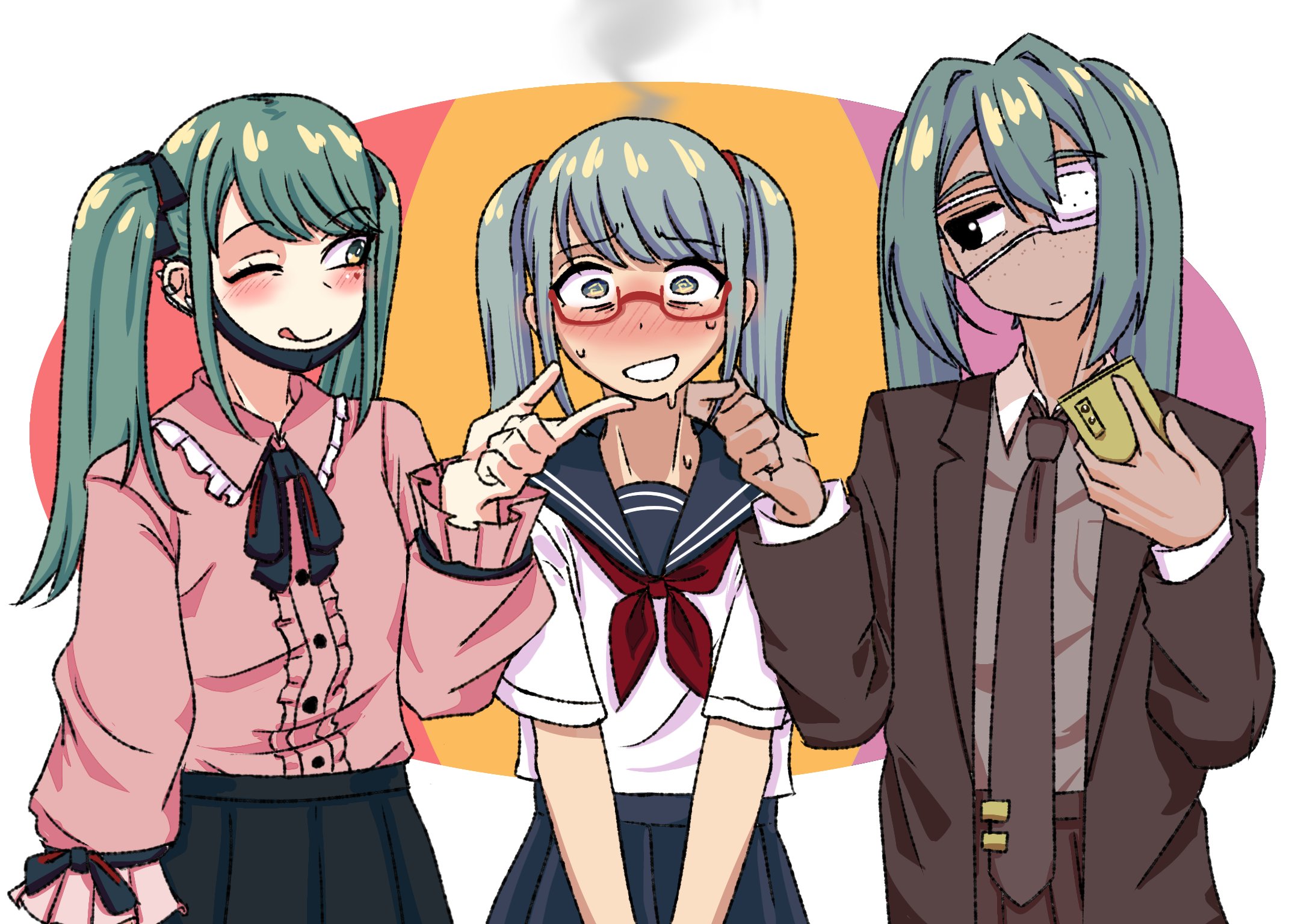 3girls black_eyes black_skirt blue_hair blue_skirt blush brown_jacket brown_necktie brown_shirt brown_skirt cellphone collared_shirt confessions_of_a_rotten_girl_(vocaloid) dual_persona glasses hair_between_eyes hatsune_miku highres holding holding_phone jacket jirai_kei long_sleeves monitoring_(vocaloid) multiple_girls necktie one_eye_closed phone pink_shirt pumpkinton red-framed_eyewear school_uniform serafuku shirt short_sleeves skirt smartphone smile steam teeth tongue tongue_out twintails vampire_(vocaloid) vocaloid white_serafuku yuri