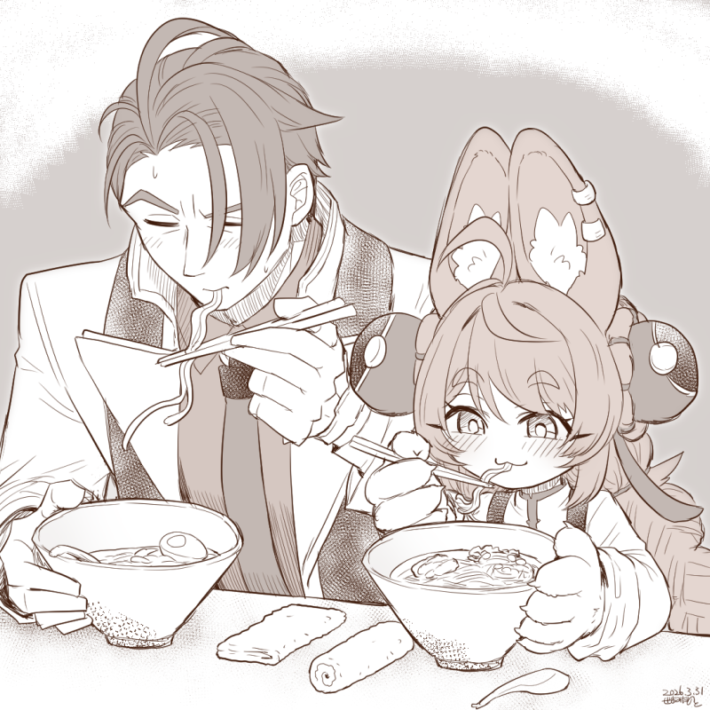 1boy 1girl :3 amida_murasaki animal_ear_fluff animal_ears animal_hands braid chopsticks closed_mouth commentary_request damian_blackwood dated eating food holding holding_chopsticks long_sleeves monochrome noodles rabbit_ears rabbit_girl ramen signature twin_braids zenless_zone_zero zhao_(zenless_zone_zero)