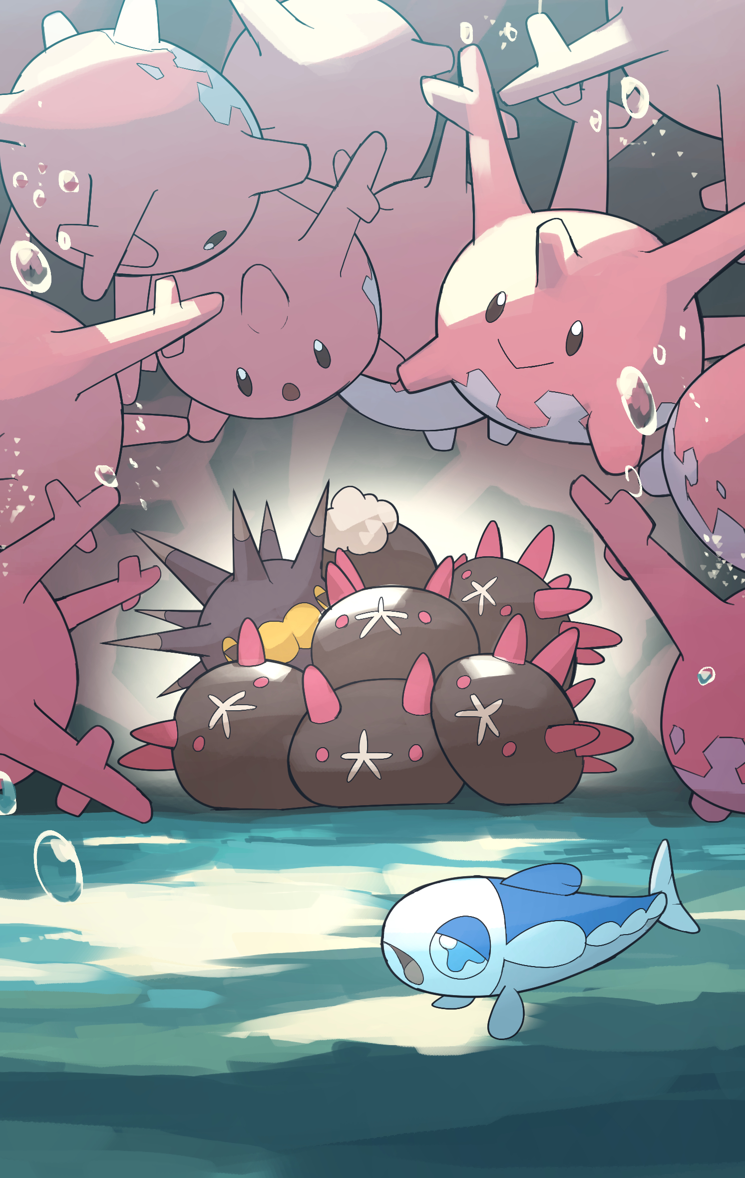 air_bubble animal_focus blue_eyes bubble closed_mouth commentary_request coral corsola fish gen_2_pokemon gen_7_pokemon gen_8_pokemon highres nintendo no_humans open_mouth pincurchin pokemon pokemon_(creature) pokemon_focus pyukumuku smile spikes underwater water_type_theme_(pokemon) wishiwashi wishiwashi_(solo) yamaori_(hakkentai_pokedan) yellow_eyes