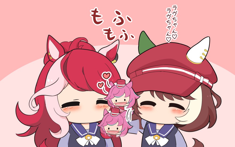 2girls animal_ears blush bow bowtie brown_hair chibi chibi_only closed_eyes commentary_request gomashio_(goma_feet) hand_puppet horse_ears horse_girl horse_tail long_hair long_sleeves loves_only_you_(umamusume) marche_lorraine_(umamusume) mismatched_ear_covers multicolored_hair multiple_girls no_mouth pink_hair puppet purple_sailor_collar purple_serafuku purple_shirt red_hair sailor_collar school_uniform serafuku shirt short_hair tail tracen_school_uniform two-tone_hair umamusume upper_body white_bow white_bowtie white_hair winter_uniform