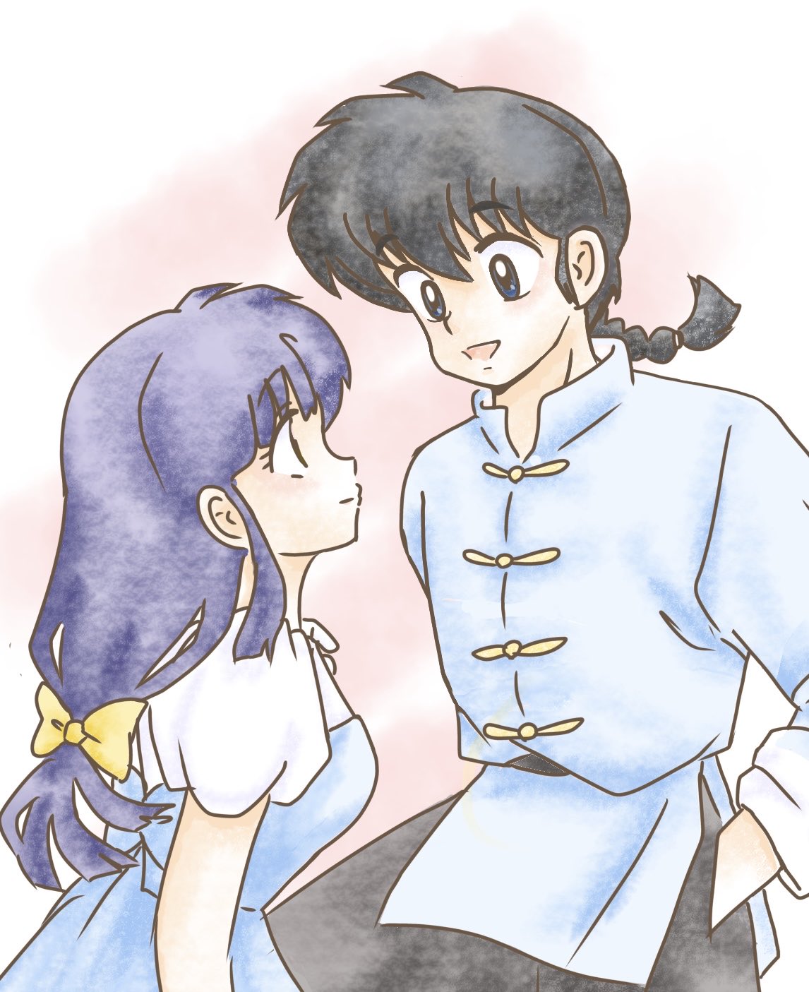1boy 1girl :d black_hair blue_dress blue_eyes blue_hair braid chacha_r_a chinese_clothes closed_mouth commentary_request dress fuurinkan_high_school_uniform hand_in_pocket highres long_hair open_mouth pink_background puffy_short_sleeves puffy_sleeves ranma_1/2 saotome_ranma school_uniform short_sleeves single_braid smile tendou_akane