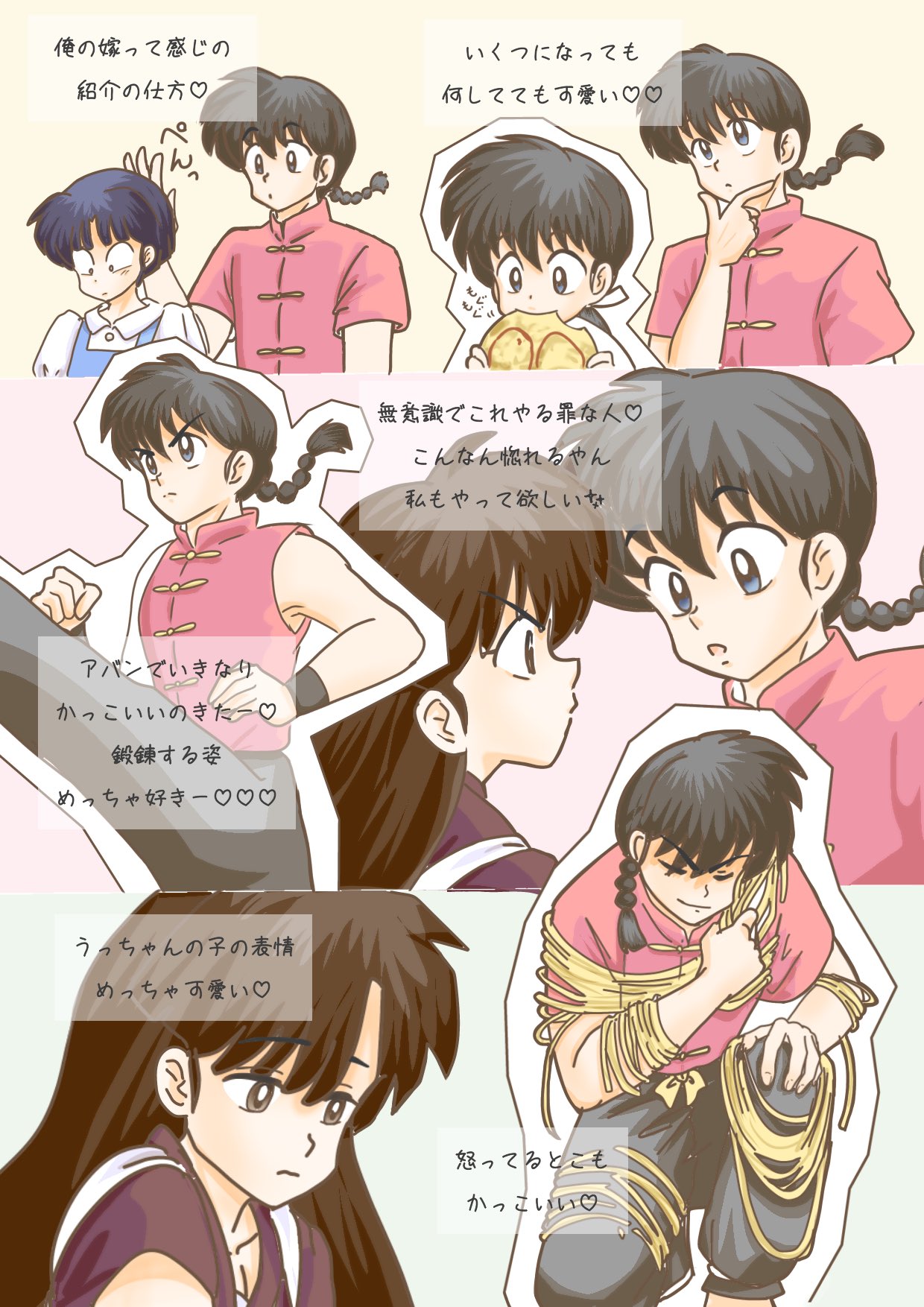 1boy 2girls black_hair blue_eyes blue_hair bound braid brown_eyes brown_hair chacha_r_a child chinese_clothes closed_eyes commentary_request eye_contact food fuurinkan_high_school_uniform highres kuonji_ukyou long_hair looking_at_another low_ponytail multiple_girls okonomiyaki ponytail ranma_1/2 saotome_ranma school_uniform short_hair single_braid sleeveless tendou_akane tied_up_(nonsexual) translation_request v-shaped_eyebrows