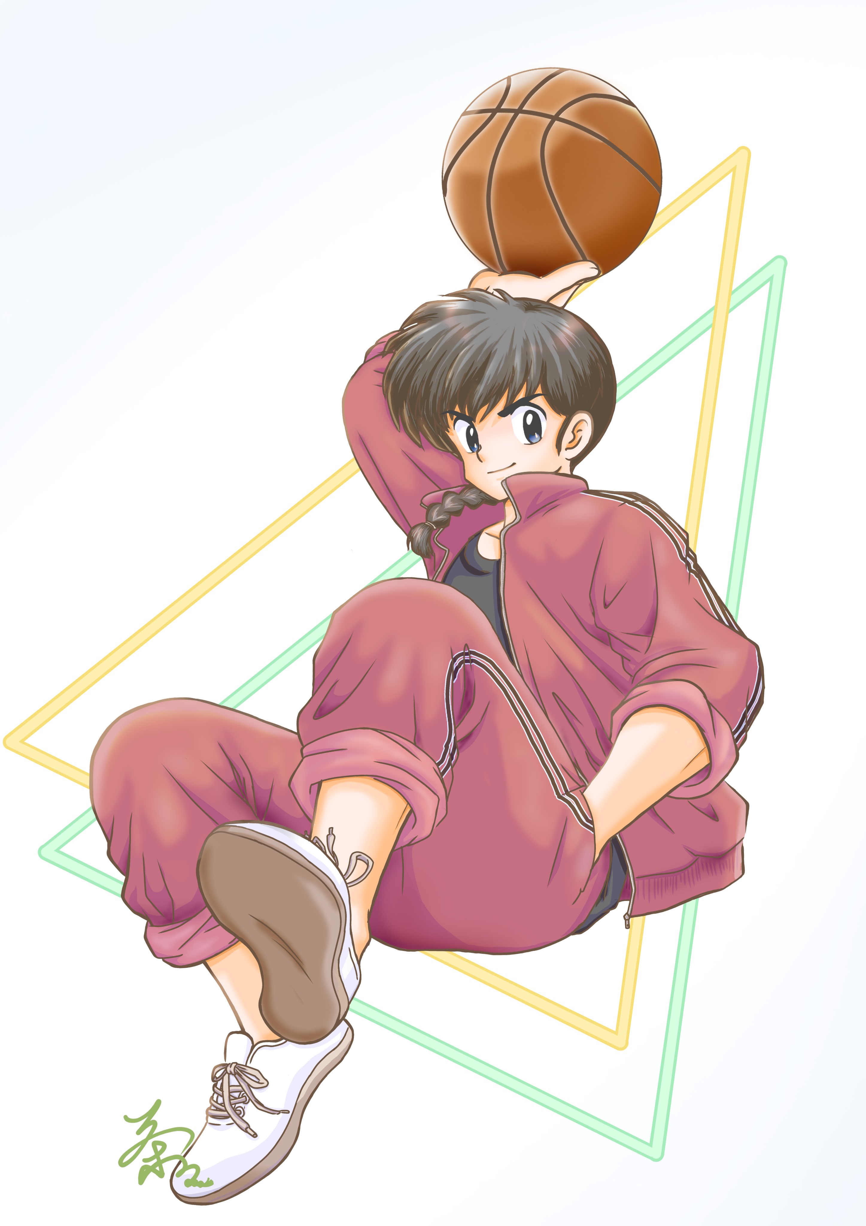 1boy absurdres arm_up ball basketball_(object) black_hair blue_eyes braid chacha_r_a closed_mouth commentary_request full_body hand_in_pocket highres holding holding_ball jacket male_focus pants ranma_1/2 red_jacket red_pants saotome_ranma shoes single_braid smile solo v-shaped_eyebrows white_shoes