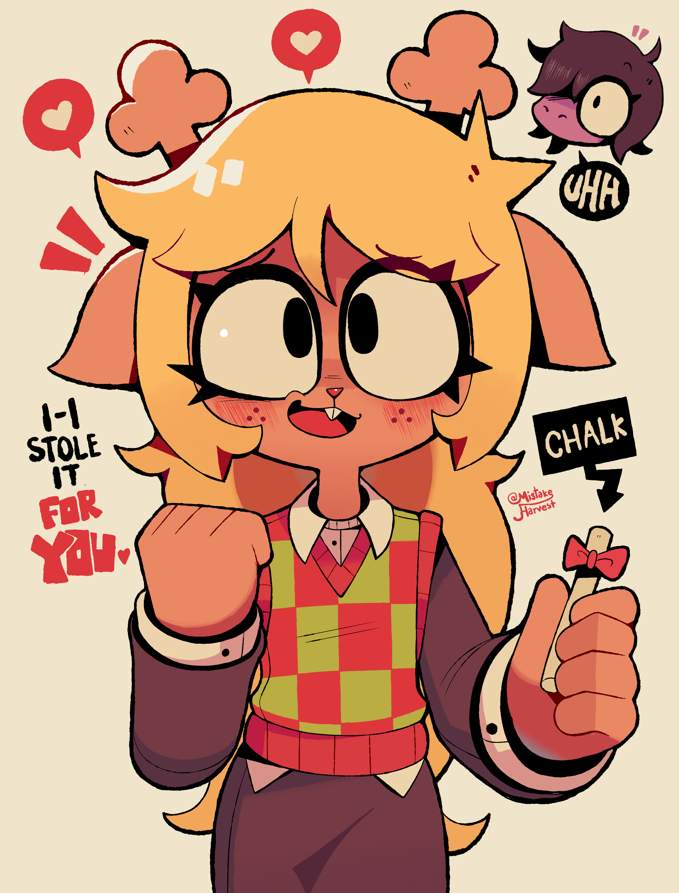 2girls absurdres animal_ears antlers arrow_(symbol) black_eyes black_shirt black_skirt blonde_hair blush bow brown_hair buck_teeth chalk checkered_sweater_vest collared_shirt colored_skin deer_ears deltarune english_text freckles furry furry_female hair_between_eyes hair_over_one_eye heart highres holding holding_chalk horns long_hair long_sleeves looking_at_viewer mistakeharvest multiple_girls noelle_holiday open_mouth purple_skin red_bow reindeer_antlers reindeer_girl shirt skirt smile speech_bubble spoken_heart susie_(deltarune) teeth tongue upper_teeth_only utdr_(toby_fox) yuri