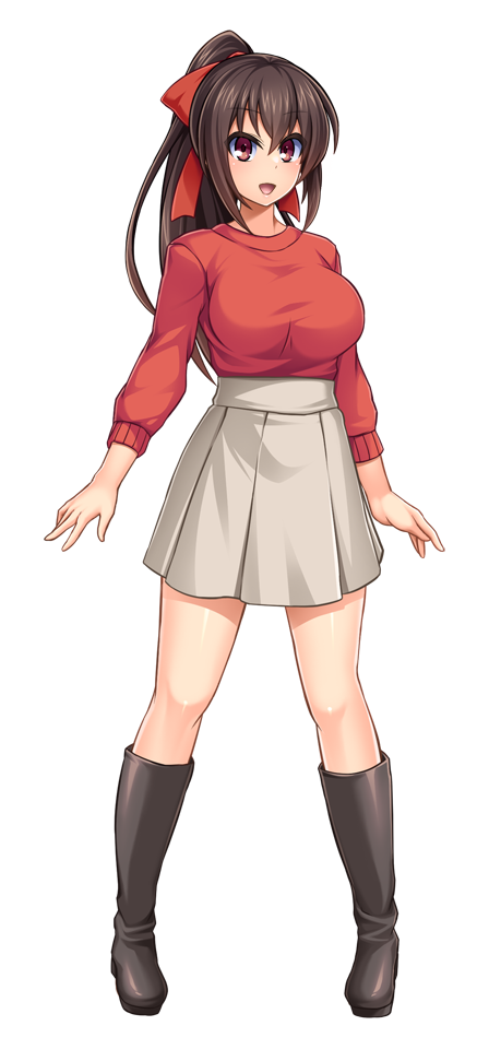 1girl :d astrae blush boots bow breasts brown_hair casual full_body game_cg grey_skirt hair_between_eyes hair_bow high-waist_skirt high_ponytail ikameshi_(nega96396) knee_boots large_breasts large_variant_set legs_apart long_hair long_sleeves looking_at_viewer non-web_source official_art open_mouth pleated_skirt ponytail red_bow red_eyes red_shirt red_sweater seisenki_iris self-datamine shirt simple_background skirt smile solo standing sweater tachi-e transparent_background variant_set