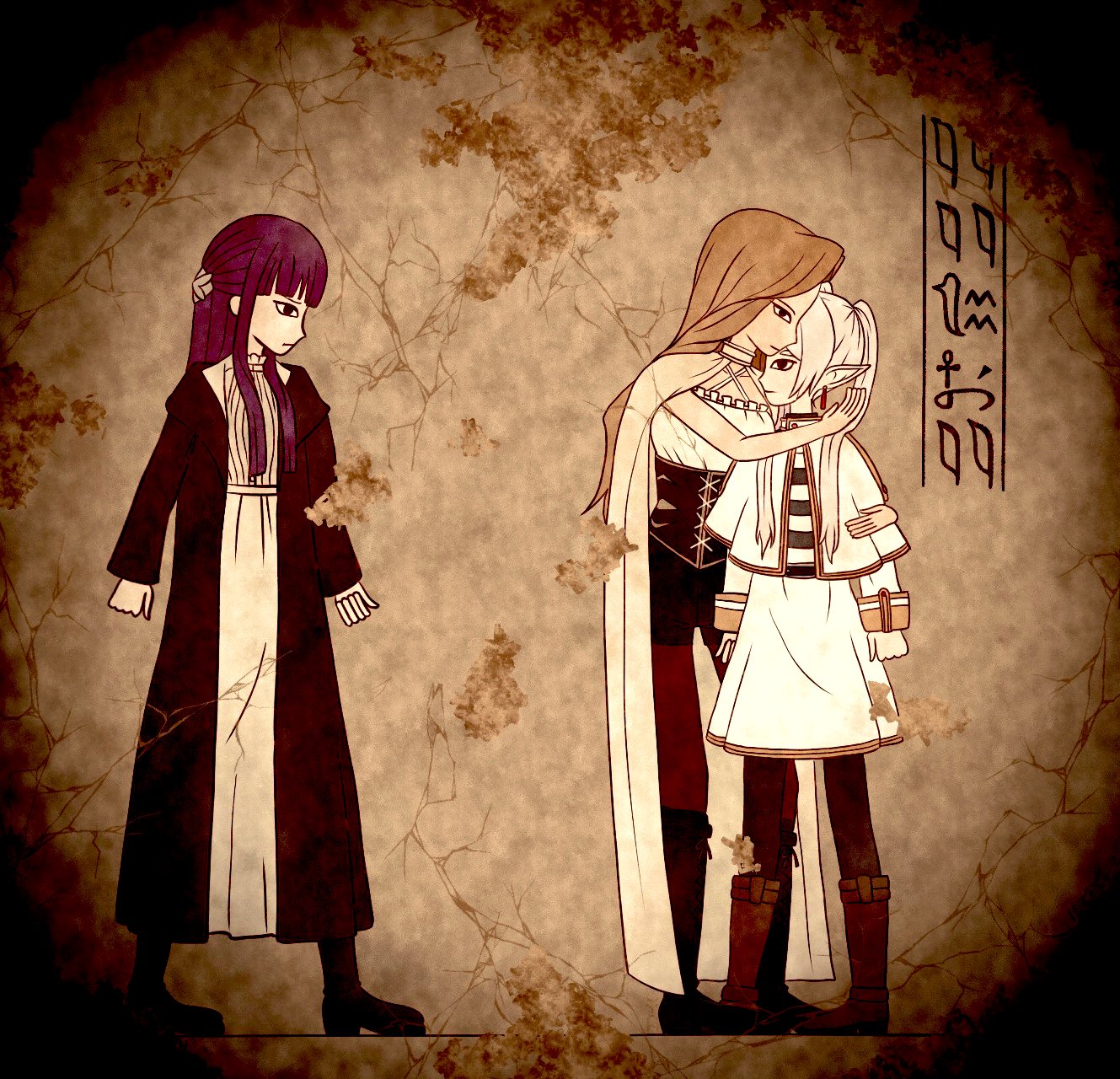 3girls black_boots black_pants blonde_hair boots brown_boots cape commentary_request corset cross-laced_clothes cross-laced_corset dress earrings elf fern frieren highres hug jewelry kita_(7kita) long_hair mature_female methode_(sousou_no_frieren) multiple_girls pants pointy_ears purple_hair sousou_no_frieren tall_female teardrop_earrings white_cape white_dress white_hair