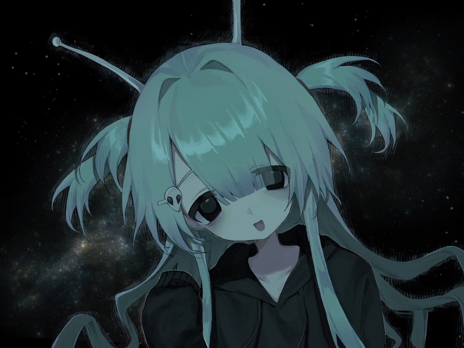 1girl alien alien_hair_ornament antennae black_eyes black_hoodie commentary hair_intakes hair_ornament hayu_(hayu0305) highres hood hood_down hoodie long_hair looking_at_viewer open_mouth original solo space two_side_up untranslatable_commentary