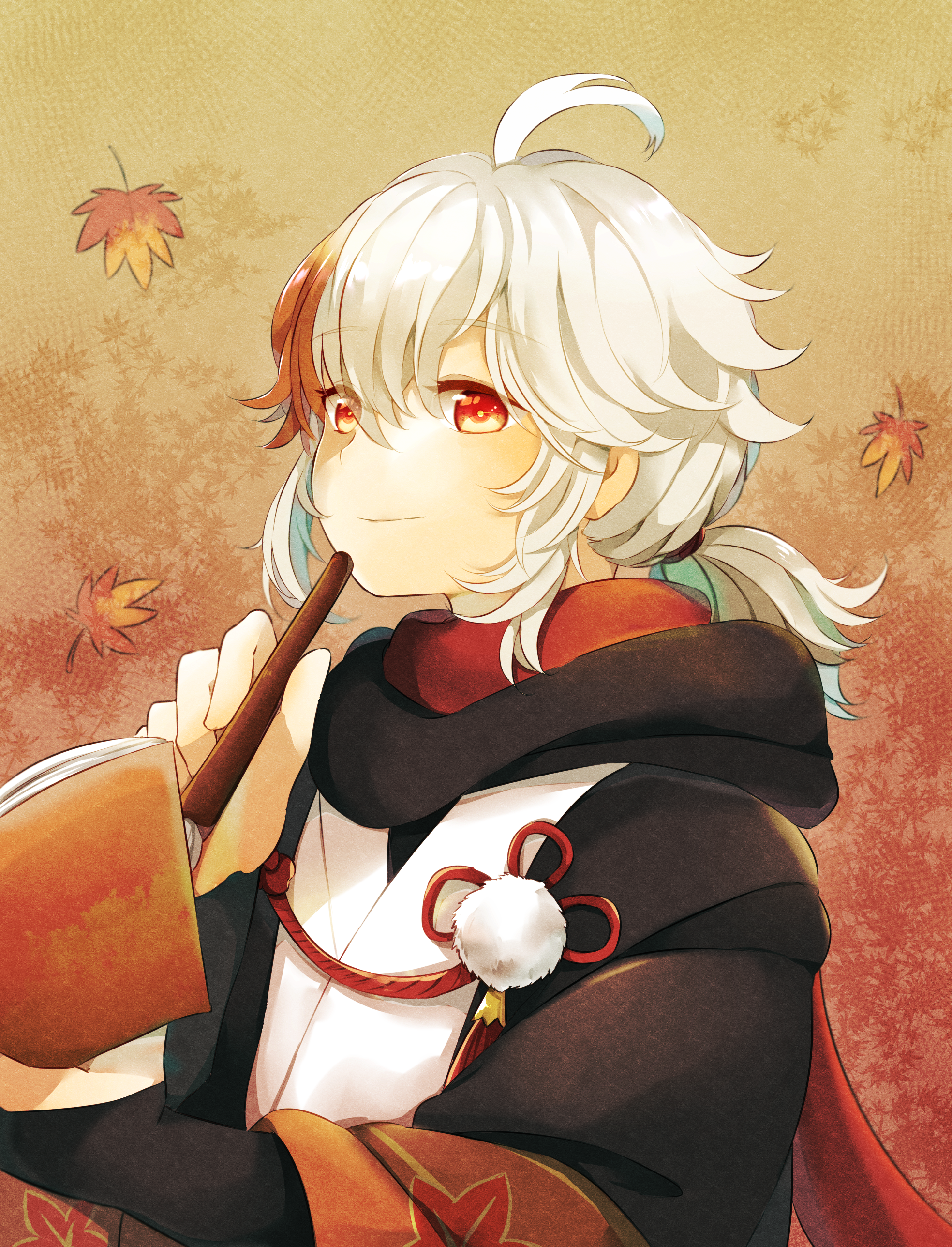 absurdres antenna_hair closed_mouth genshin_impact hair_between_eyes highres houzuki_ringo japanese_clothes kaedehara_kazuha looking_at_viewer male_focus multicolored_hair orange_eyes ponytail red_eyes red_hair smile solo streaked_hair white_hair