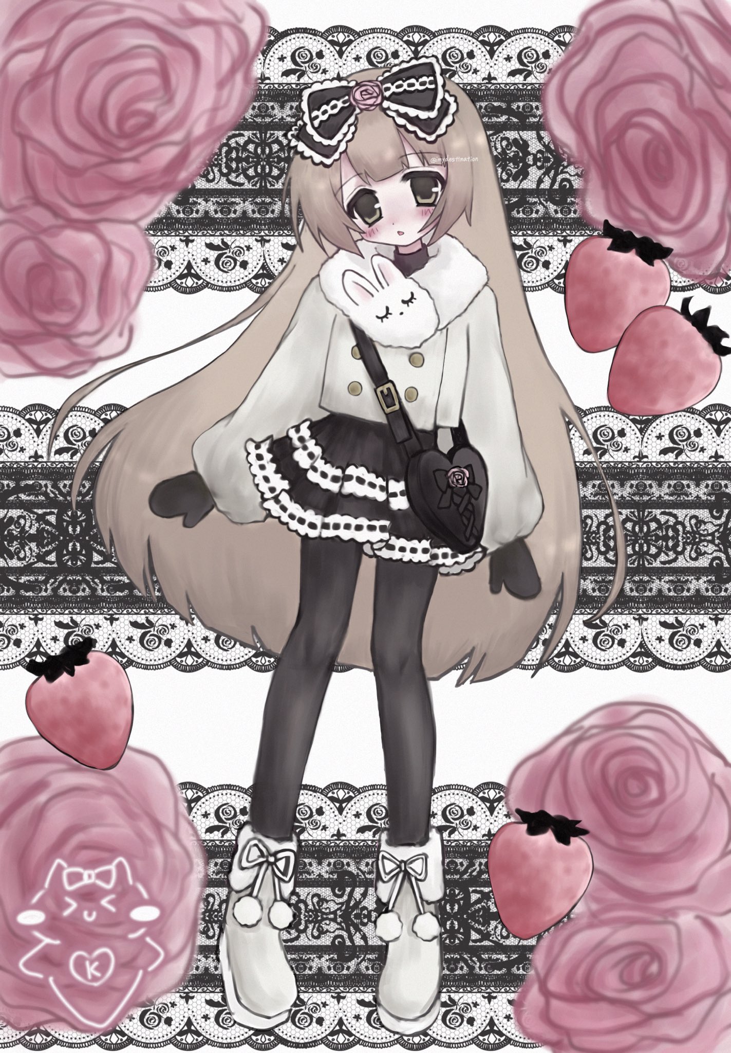1girl animal_scarf ascii_art bag blush boots bow brown_eyes brown_hair buttons cropped_jacket crossbody_bag double-breasted flower food fruit full_body fur-trimmed_boots fur_trim hair_bow heart-shaped_bag highres imydestination lace_background long_hair long_sleeves looking_at_viewer mittens original pantyhose parted_lips pom_pom_(clothes) pom_pom_footwear rabbit_scarf ribbon-trimmed_skirt ribbon_trim rose scarf shoulder_bag solo strawberry turtleneck very_long_hair
