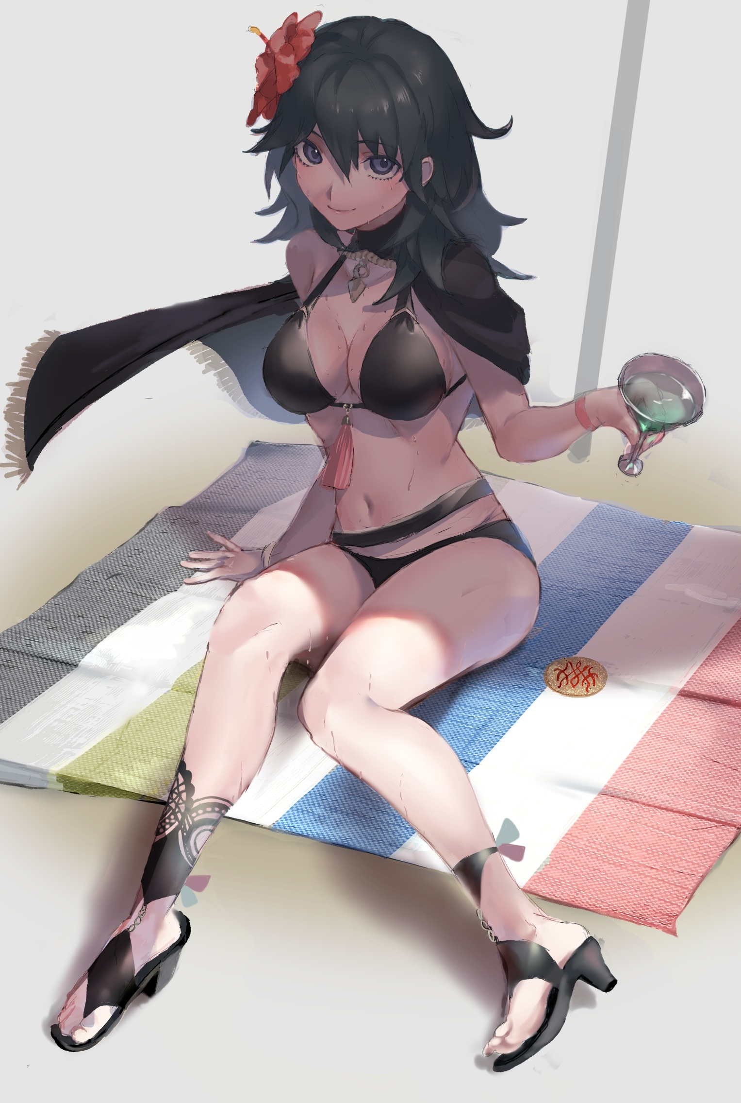 1girl beach beach_towel beach_umbrella bikini black_bikini black_cape blue_eyes blue_hair breasts cape closed_mouth cocktail_glass commentary_request cup drinking_glass female_byleth_(fire_emblem) female_byleth_(summer)_(fire_emblem) fire_emblem fire_emblem:_three_houses fire_emblem_heroes flower from_above green_hair hair_flower hair_ornament hibiscus high_heel_sandals high_heels highres holding holding_cup jewelry large_breasts legs long_hair looking_at_viewer miton_(vvse5752) navel necklace nintendo official_alternate_costume pumps red_flower sandals shade sitting smile solo swimsuit towel umbrella wet