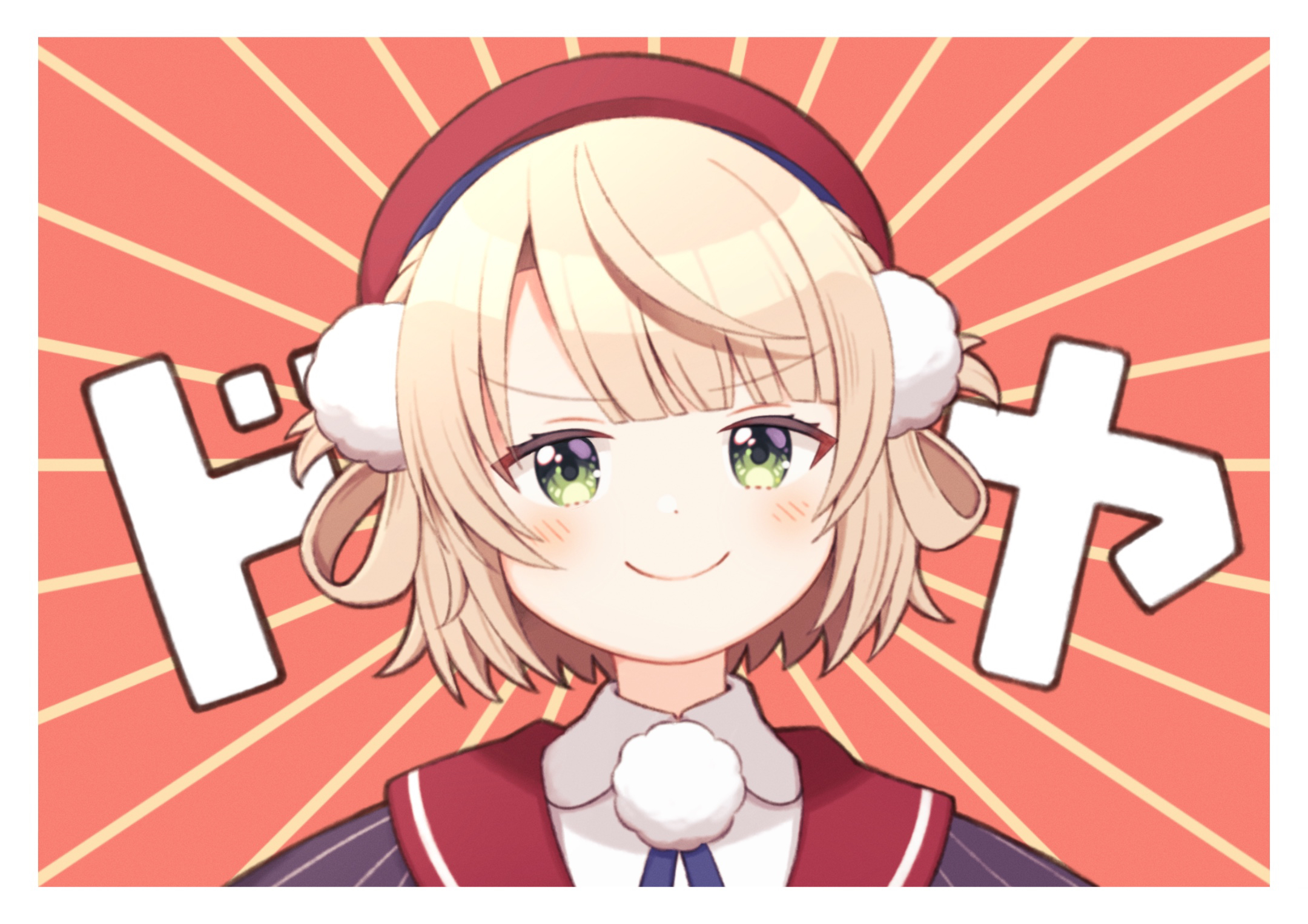 >:) 1girl apple_(zdj0266) beret doyagao emphasis_lines green_eyes hair_ornament hair_rings hat highres indie_virtual_youtuber looking_at_viewer pinstripe_jacket pinstripe_pattern pinstripe_shirt pom_pom_(clothes) pom_pom_hair_ornament portrait red_hat red_sailor_collar sailor_collar shigure_ui_(1st_costume)_(vtuber) shigure_ui_(vtuber) shirt short_hair smile smug solo sunburst sunburst_background v-shaped_eyebrows virtual_youtuber