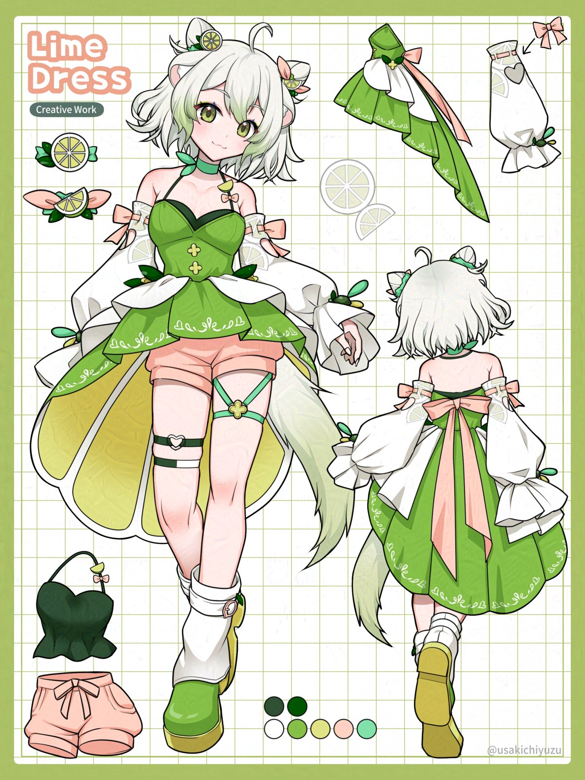 1girl ahoge animal_ears boots breasts detached_sleeves dress eyeliner ferret_ears ferret_girl ferret_tail food fruit gradient_hair gradient_tail green_dress green_eyeliner green_eyes green_hair highres indie_virtual_youtuber lime_(fruit) lime_slice limealicious makeup multicolored_hair pink_shorts shorts tail thigh_strap thighs usakichiyuzu virtual_youtuber white_hair