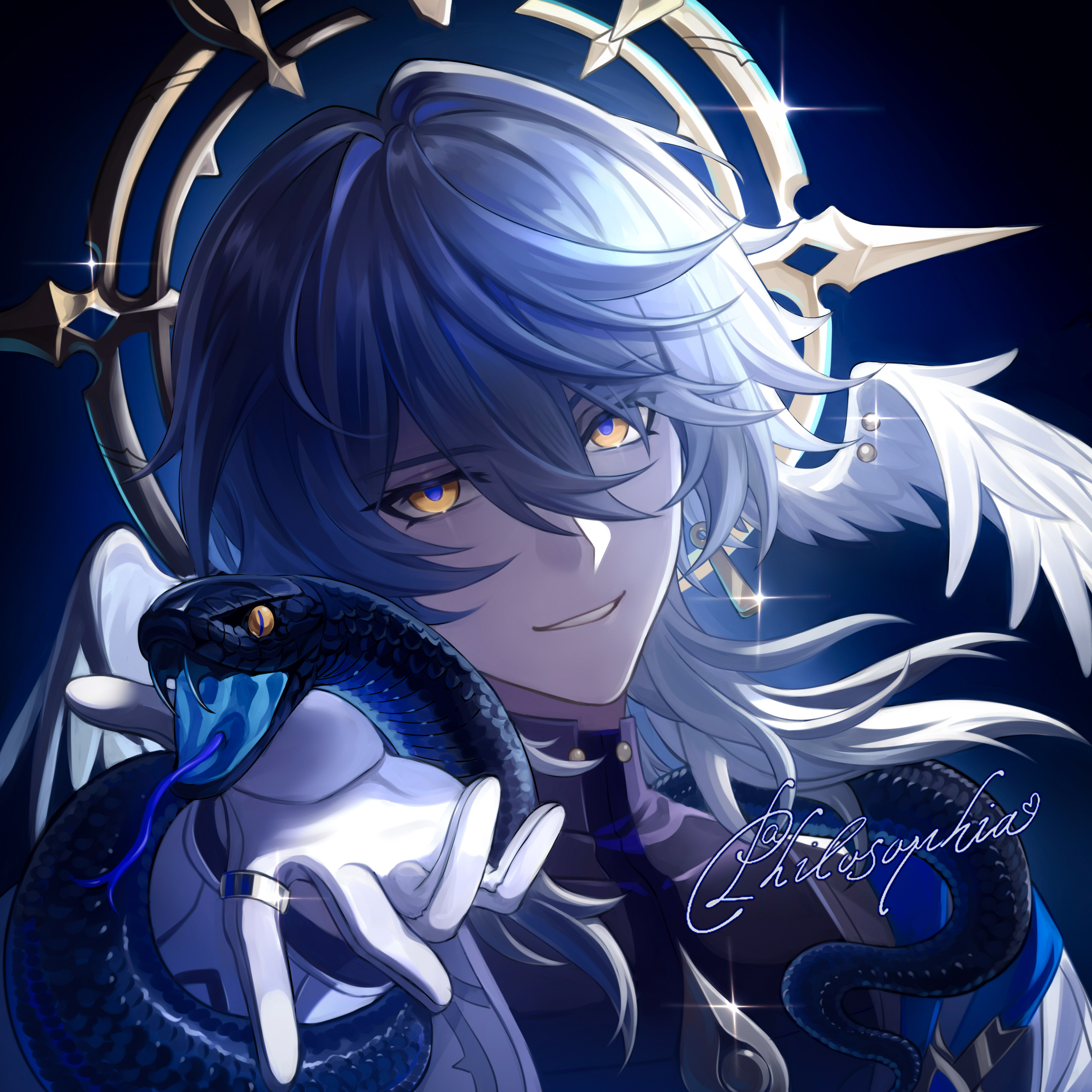 1boy animal blue_hair commentary_request earrings feathered_wings gloves hair_between_eyes halo halo_behind_head hand_up head_wings highres honkai:_star_rail honkai_(series) jewelry long_hair looking_at_viewer male_focus parted_lips philosophia ring smile snake solo sunday_(honkai:_star_rail) upper_body white_gloves wings yellow_eyes
