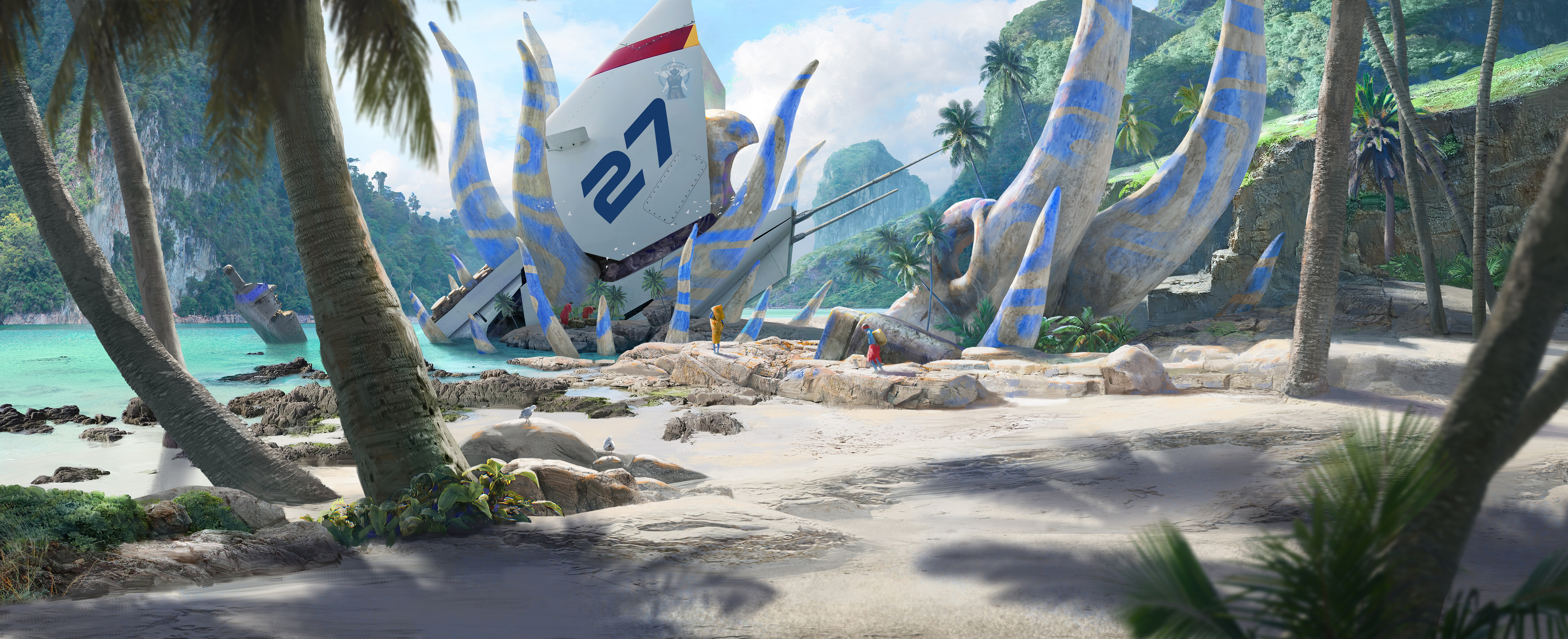 4others absurdres beach bird blue_skin blue_sky chinese_commentary cloud colored_skin day dress flock giant_skull highres horns jungle landscape leaf mountain multiple_others nature ocean original outdoors paint palm_tree plant red_skirt rock sand scenery skirt sky spacecraft sunlight tree tropical water wreckage yellow_dress zhongjusun