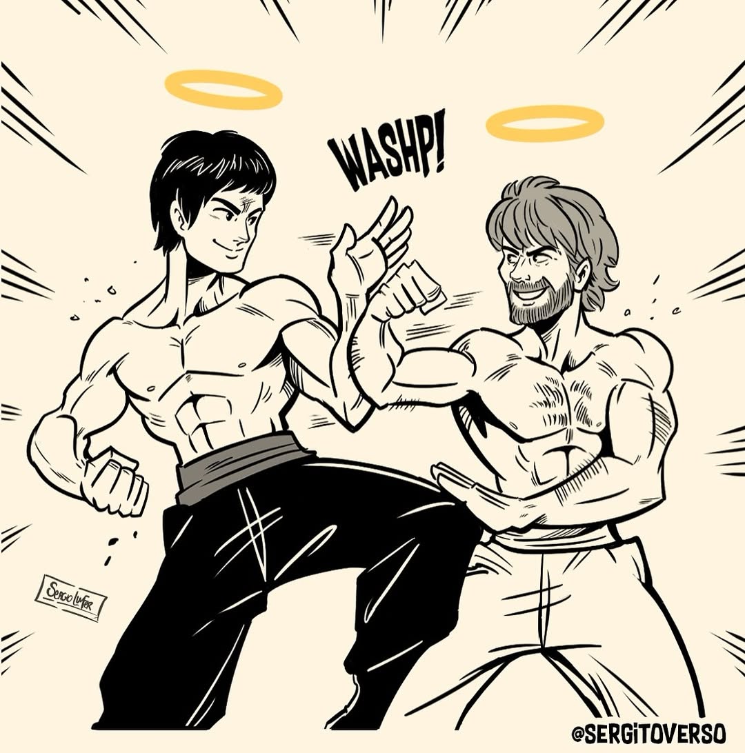 2boys abs arm_hair beard bruce_lee chest_hair chuck_norris colt_(the_way_of_the_dragon) eye_contact facial_hair fighting greyscale halo instagram_username looking_at_another male_focus monochrome motion_lines multiple_boys sergitoverso short_hair smile spanish_commentary tang_lung the_way_of_the_dragon topless_male