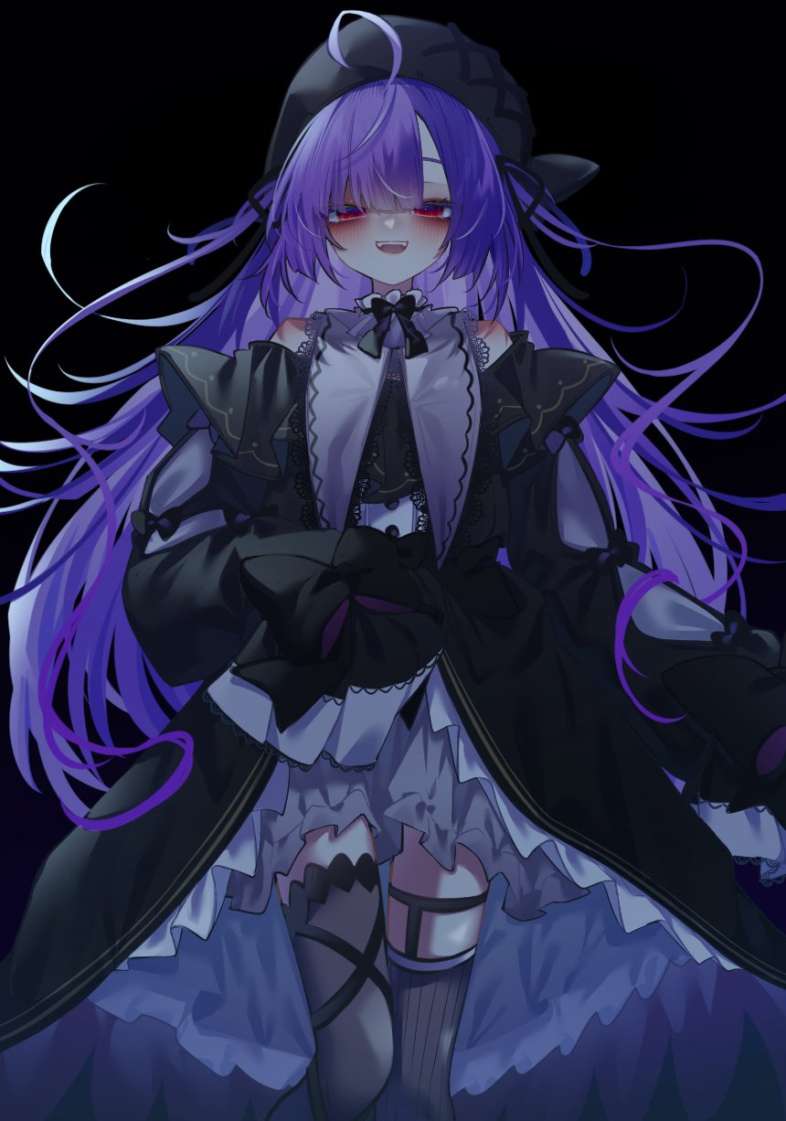 1girl :d ahoge asymmetrical_legwear black_background black_dress black_hat black_thighhighs dress frilled_dress frills gothic_lolita hat hatuho_1223 highres layered_dress lolita_fashion long_hair looking_at_viewer nanashi_inc. open_mouth purple_hair red_eyes shisui_kiki shisui_kiki_(2nd_costume) simple_background sleeves_past_fingers sleeves_past_wrists smile solo thighhighs very_long_hair virtual_youtuber