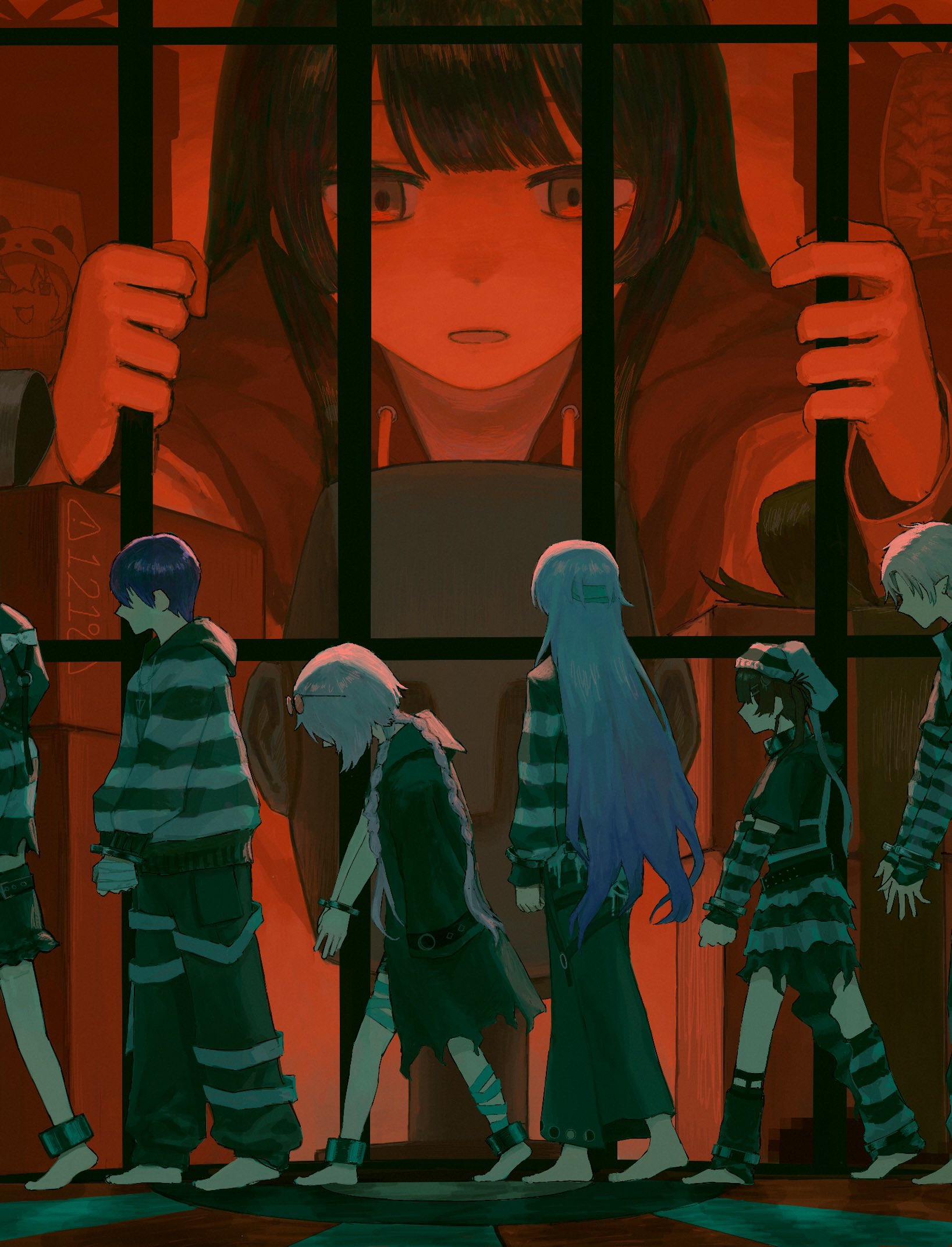 3boys 3girls alternate_costume bandages barefoot black_hair braid cuffs eyewear_on_head glass hada_(curlyha1r) handcuffs head_down highres holding hoshirube_sho kenmochi_touya kuzuha_(nijisanji) long_hair multicolored_hair multiple_boys multiple_girls multiple_hair_clips nijisanji official_alternate_costume pink_hair pointy_ears prison prison_cell prison_clothes purple_hair rabbit_ear_hat sasaki_saku shiina_yuika short_hair staring striped_clothes torn_clothes tsukino_mito twin_braids twintails virtual_youtuber white_hair