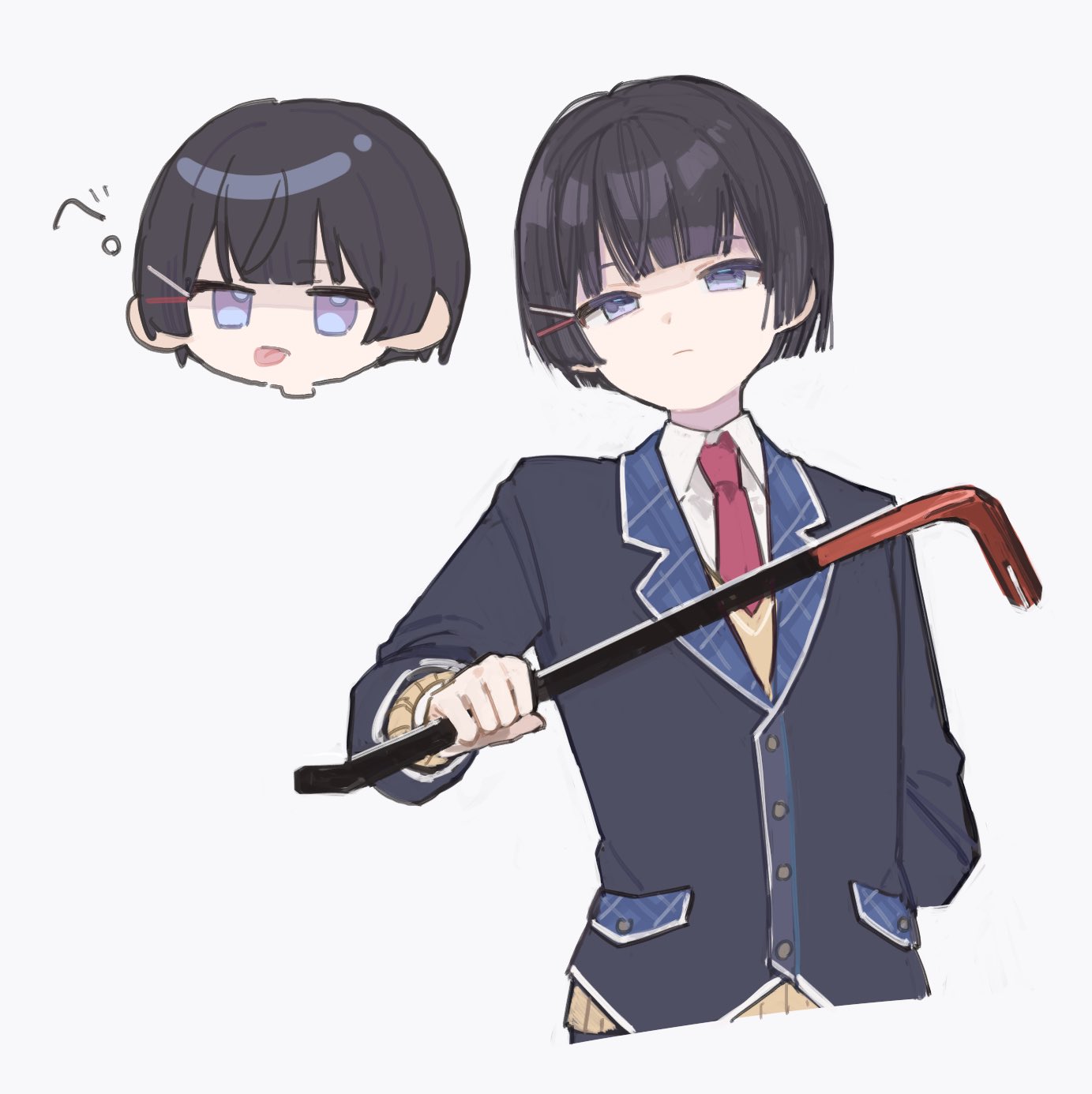 april_fools arm_behind_back black_hair blue_eyes crowbar genderswap genderswap_(ftm) hair_ornament hairclip highres holding holding_crowbar holding_weapon kmgm_co multiple_hair_clips necktie nijisanji school_uniform short_hair tongue tongue_out tsukino_mito virtual_youtuber weapon white_background
