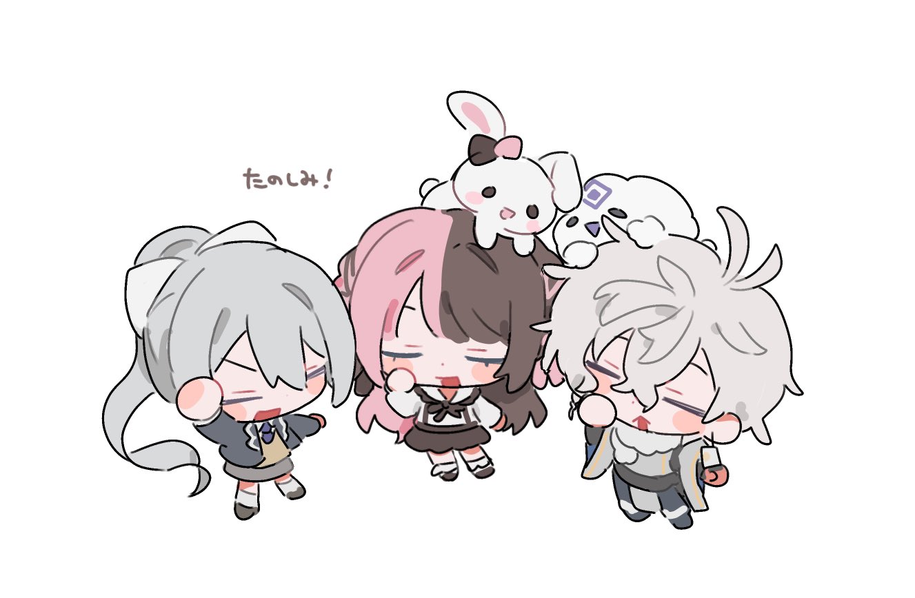1boy 2girls antenna_hair blush bow bowtie brown_skirt chibi chibi_only closed_eyes creature higuchi_kaede higuchi_kaede_(1st_costume) long_hair mqlawr multicolored_hair multiple_girls murakumo_kagetsu murakumo_kagetsu_(1st_costume) nijisanji ninja open_mouth ponytail rabbit school_uniform short_hair skirt socks tachibana_hinano tachibana_hinano_(1st_costume) virtual_youtuber vspo! white_background white_hair