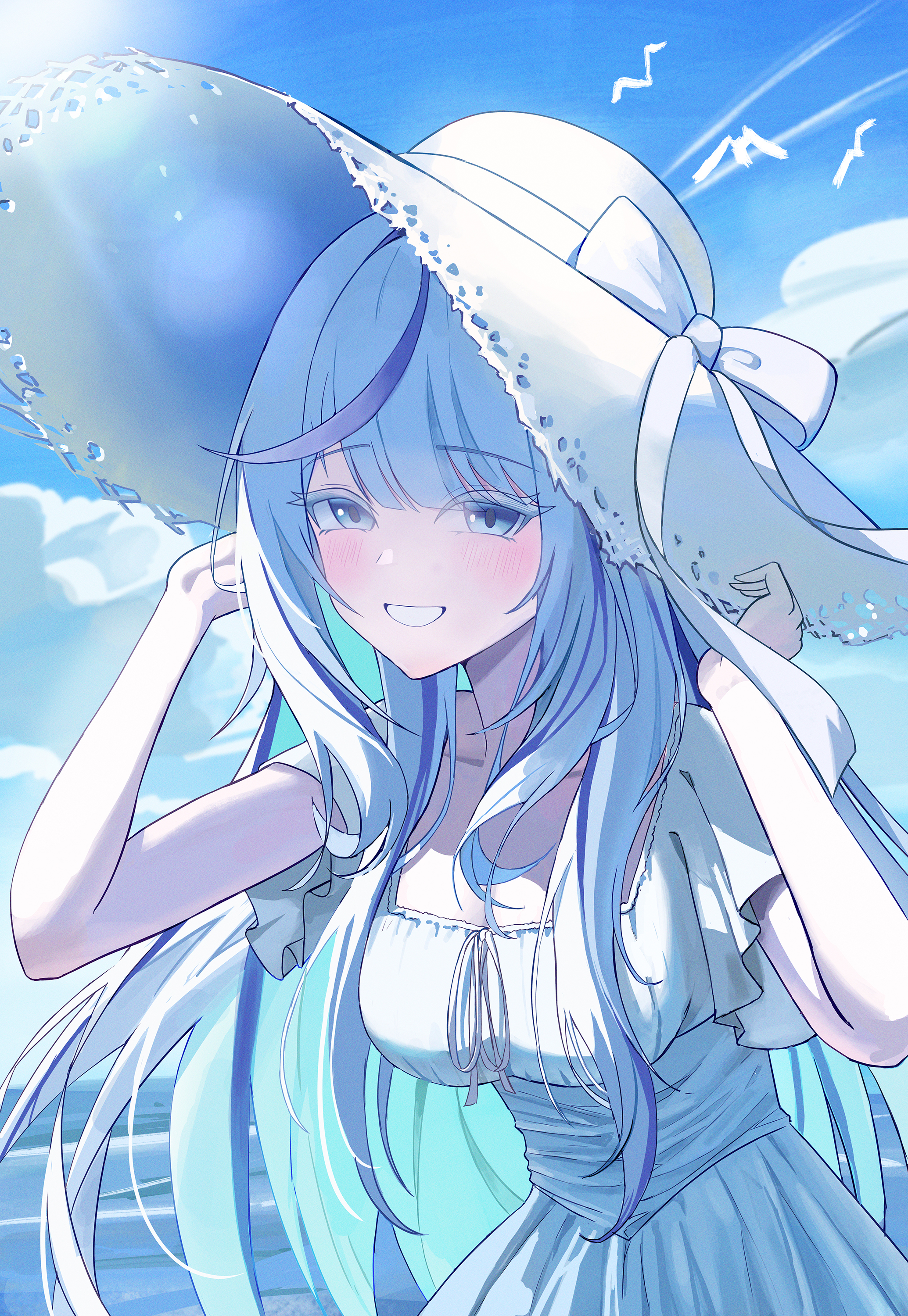 1girl absurdres aokumo_rin blue_eyes blue_hair blue_sky blue_streaks bow breasts cloud colored_eyelashes colored_inner_hair commentary day dress gang_ryeol grin hat hat_bow highres lens_flare light_blush long_hair looking_at_viewer medium_breasts multicolored_hair ocean outdoors simple_bird sky smile solo stellive streaked_hair sun sun_hat untranslatable_commentary upper_body virtual_youtuber white_bow white_dress white_eyelashes white_hair white_hat