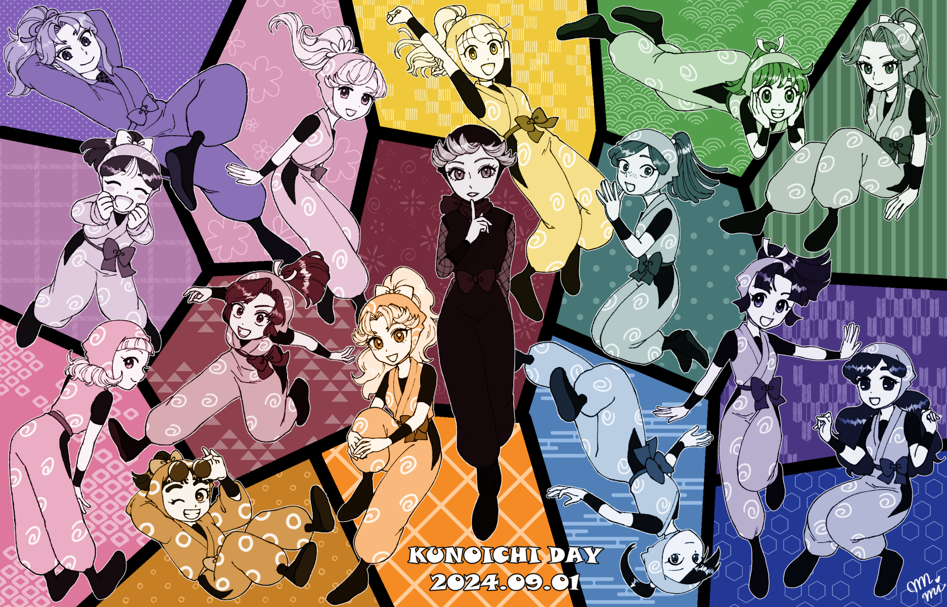 6+girls akko_(rakudai_ninja_rantarou) ayaka_(rakudai_ninja_rantarou) blush_stickers bow closed_eyes commentary_request eeko_(rakudai_ninja_rantarou) egasumi grin hair_bow hair_ribbon highres iiko_(rakudai_ninja_rantarou) japanese_clothes kitaishi_teruyo kunoichi_day mika_(rakudai_ninja_rantarou) multiple_girls nanairorecipe naomi_(rakudai_ninja_rantarou) ninja one_eye_closed open_mouth ponytail rakudai_ninja_rantarou ribbon seigaiha shige_(rakudai_ninja_rantarou) shiori_(rakudai_ninja_rantarou) smile souko_(rakudai_ninja_rantarou) tomomi_(rakudai_ninja_rantarou) ukko_(rakudai_ninja_rantarou) yagasuri yamabuki_(rakudai_ninja_rantarou) yamamoto_shina yuki_(rakudai_ninja_rantarou)