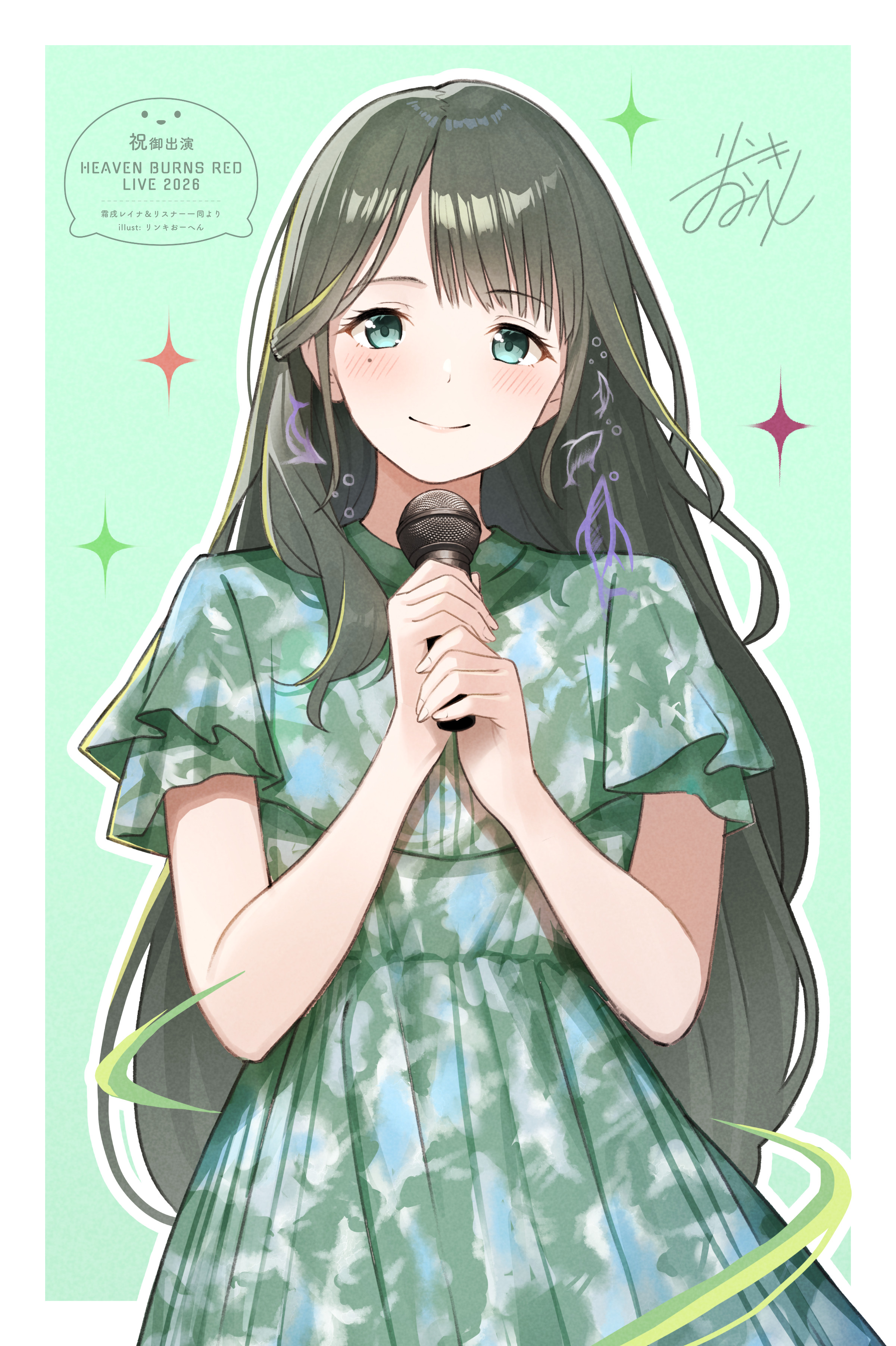 1girl absurdres blunt_bangs blush border closed_mouth commentary_request copyright_name cowboy_shot dress eyelashes green_background green_dress green_eyes green_hair green_theme hands_up heaven_burns_red highres holding holding_microphone long_hair looking_at_viewer microphone mole mole_under_eye narby_(heaven_burns_red) outline outside_border pleated_dress real_life rinki_oohen short_sleeves sidelocks signature simple_background smile solo split_mouth very_long_hair white_border white_outline yanaginagi