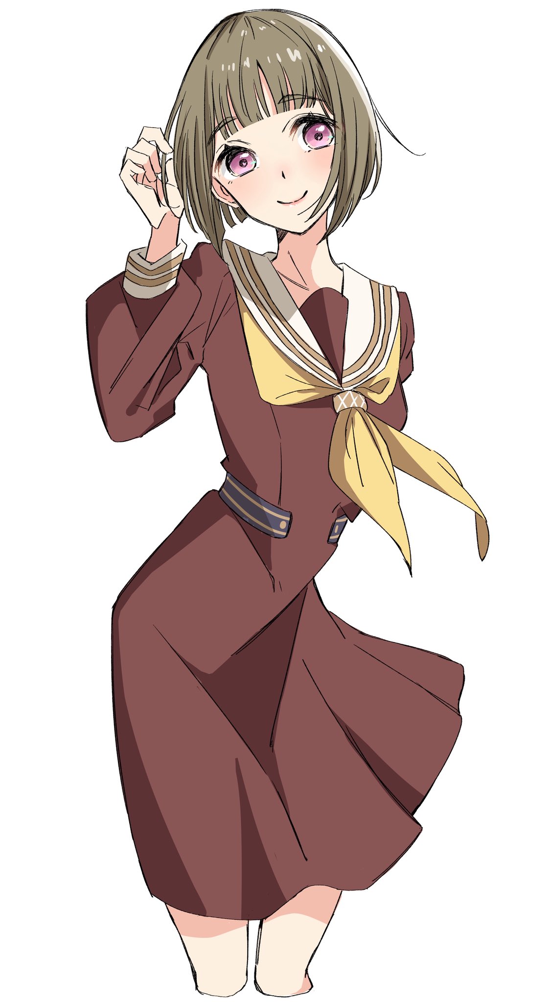 1girl alternate_hair_length_(shorter) bien_(djpwjd1) blush bob_cut brown_dress brown_hair commentary_request dress hand_up hasu_no_sora_school_uniform highres inverted_bob kachimachi_kosuzu link!_like!_love_live! long_sleeves looking_to_the_side love_live! medium_dress neckerchief official_alternate_hairstyle pink_eyes pleated_dress sailor_collar sailor_dress school_uniform short_hair solo virtual_youtuber white_sailor_collar winter_uniform yellow_neckerchief