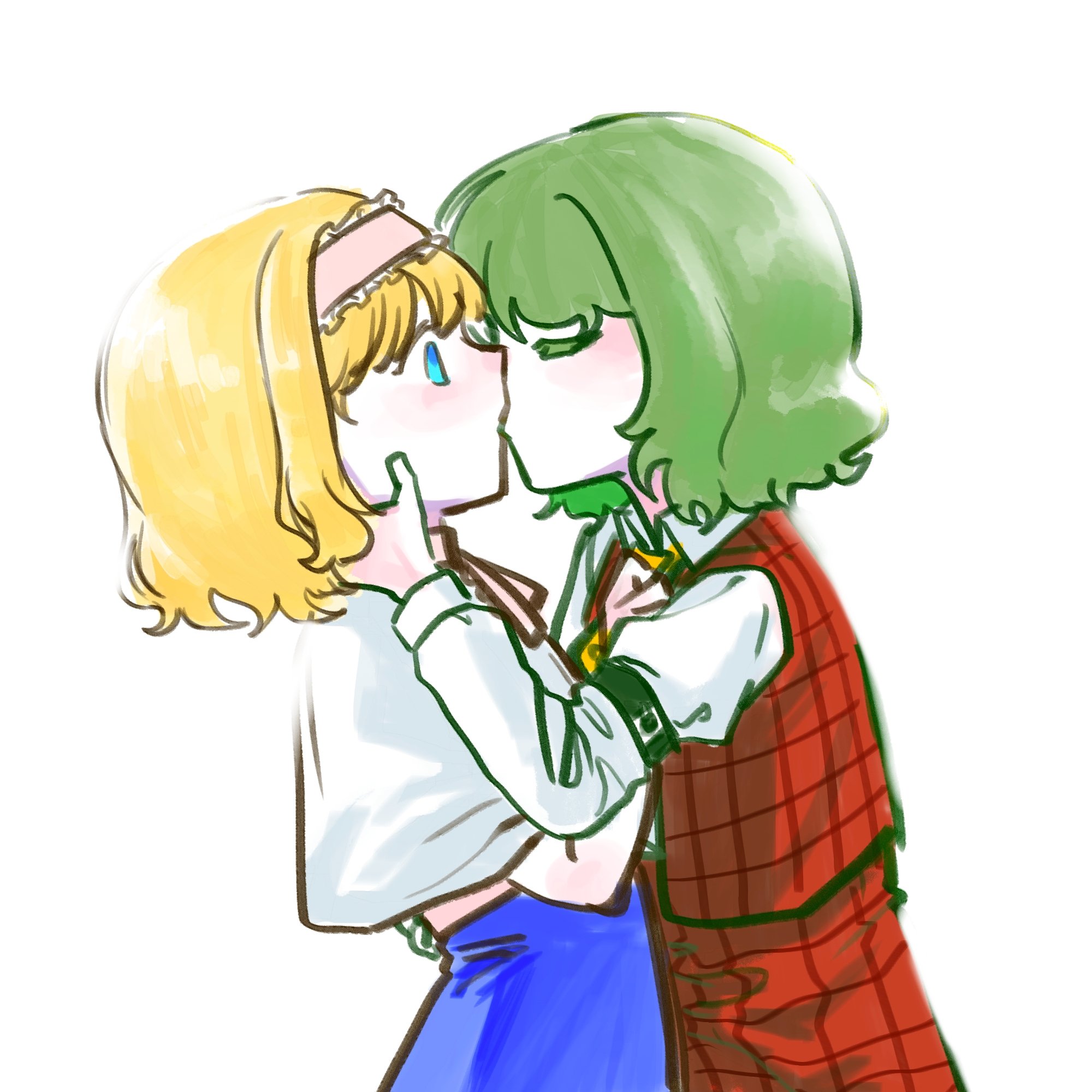 2girls alice_margatroid ascot blonde_hair blue_dress blue_eyes blush bow capelet commentary_request dress frills green_hair hair_bow hairband highres kazami_yuuka kiss korean_commentary long_sleeves lovelobten multiple_girls plaid_clothes plaid_skirt plaid_vest red_eyes ribbon shirt short_hair skirt skirt_set touhou vest white_background yuri