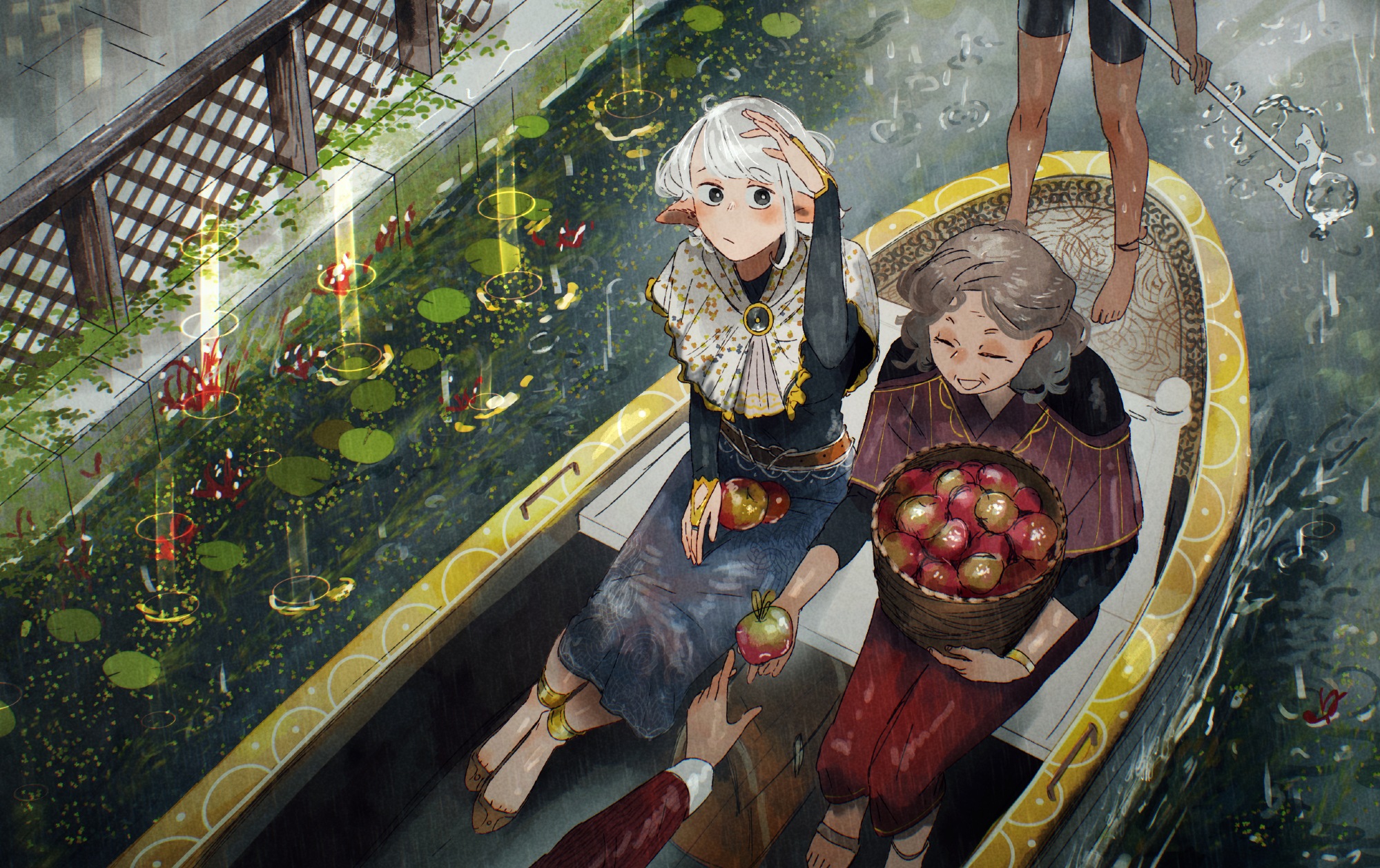 1other apple asimov_(spindle_(aidenr0)) basket bike_shorts black_eyes boat bridal_gauntlets bright_pupils closed_eyes dark-skinned_female dark_skin elf food from_above fruit gondola hair_bun highres holding holding_basket holding_food holding_fruit loose_hair_strand old old_woman original outdoors pants pointy_ears rain red_pants shading_eyes single_hair_bun sitting spindle_(aidenr0) watercraft white_hair white_pupils yellow_trim