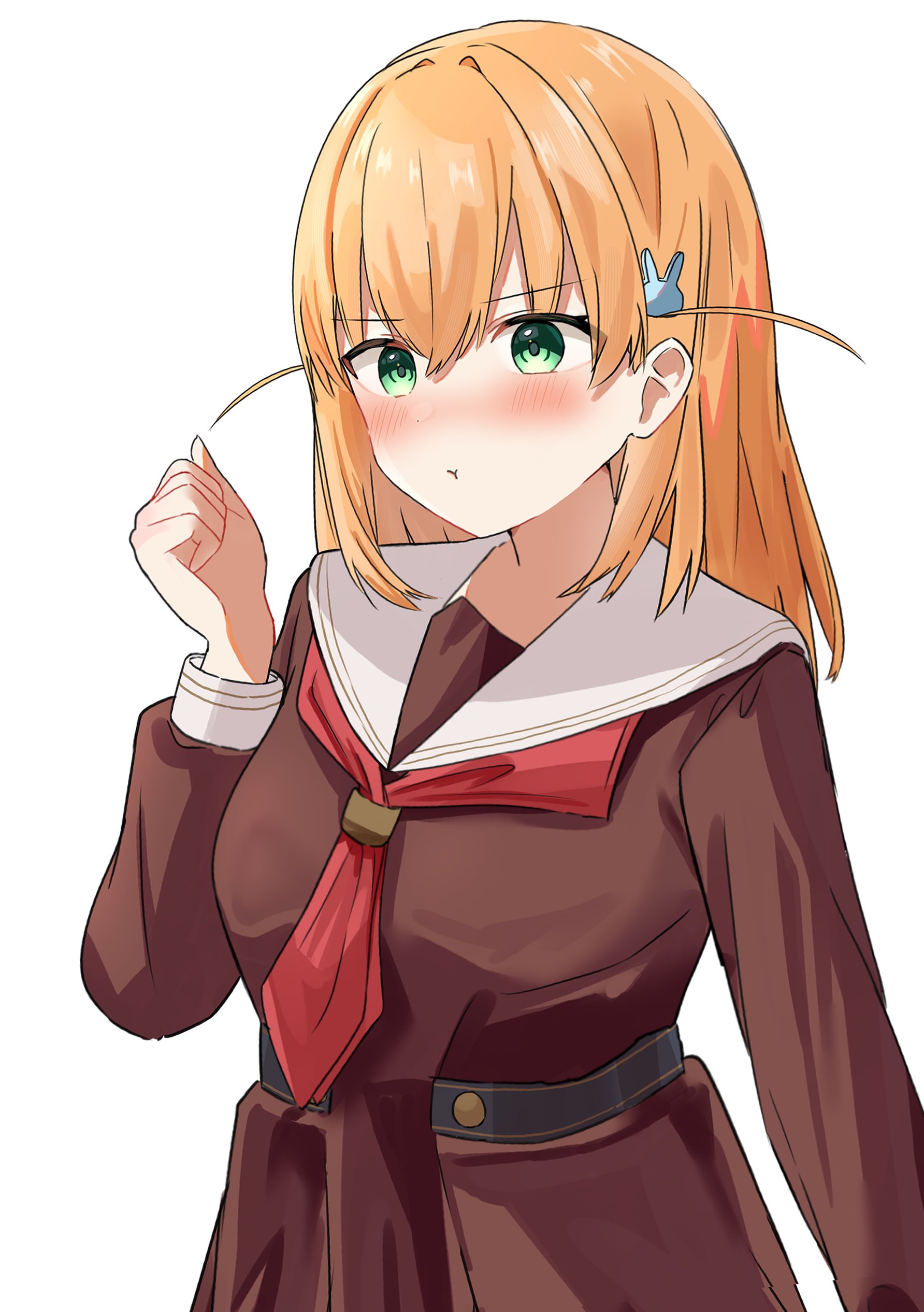 1girl :t absurdres blush breasts brown_dress clenched_hand commentary cosplay crossed_bangs dress green_eyes hasu_no_sora_school_uniform highres hinoshita_kaho hinoshita_kaho_(cosplay) hisho_(rythm_hisho) link!_like!_love_live! long_hair long_sleeves love_live! medium_breasts momose_ginko neckerchief nose_blush orange_hair pout red_hair red_neckerchief sailor_collar sailor_dress school_uniform simple_background solo two_side_up virtual_youtuber white_background white_sailor_collar winter_uniform