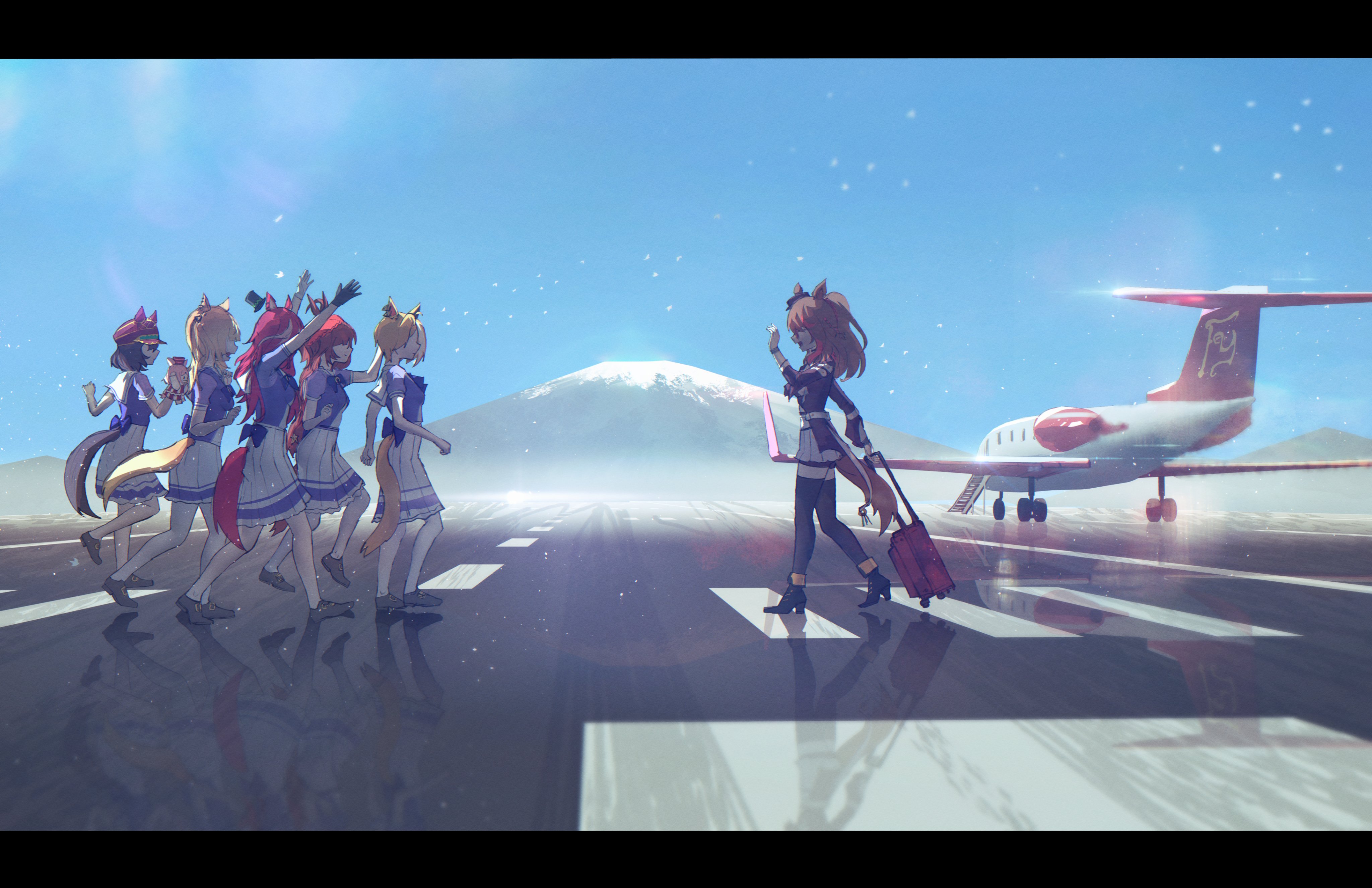 6+girls absurdres advarcher aircraft airplane airport animal_ears black_boots black_gloves blue_sky boots bow bowtie breasts brown_hair casino_drive_(umamusume) commentary ear_covers ears_through_headwear english_commentary espoir_city_(umamusume) fedora forever_young_(umamusume) gloves hair_between_eyes hand_puppet hat highres horse_ears horse_girl horse_tail jacket jewelry letterboxed long_hair loves_only_you_(umamusume) marche_lorraine_(umamusume) multicolored_hair multiple_girls open_mouth orange_hair outdoors puffy_short_sleeves puffy_sleeves puppet purple_bow purple_bowtie purple_shirt red_desire_(umamusume) red_hair red_jacket red_streaks red_veil rolling_suitcase sailor_collar school_uniform shirt short_hair short_sleeves skirt sky smile streaked_hair suitcase sunglasses tail thighhighs tinted_eyewear tracen_school_uniform umamusume veil white_sailor_collar white_skirt white_thighhighs