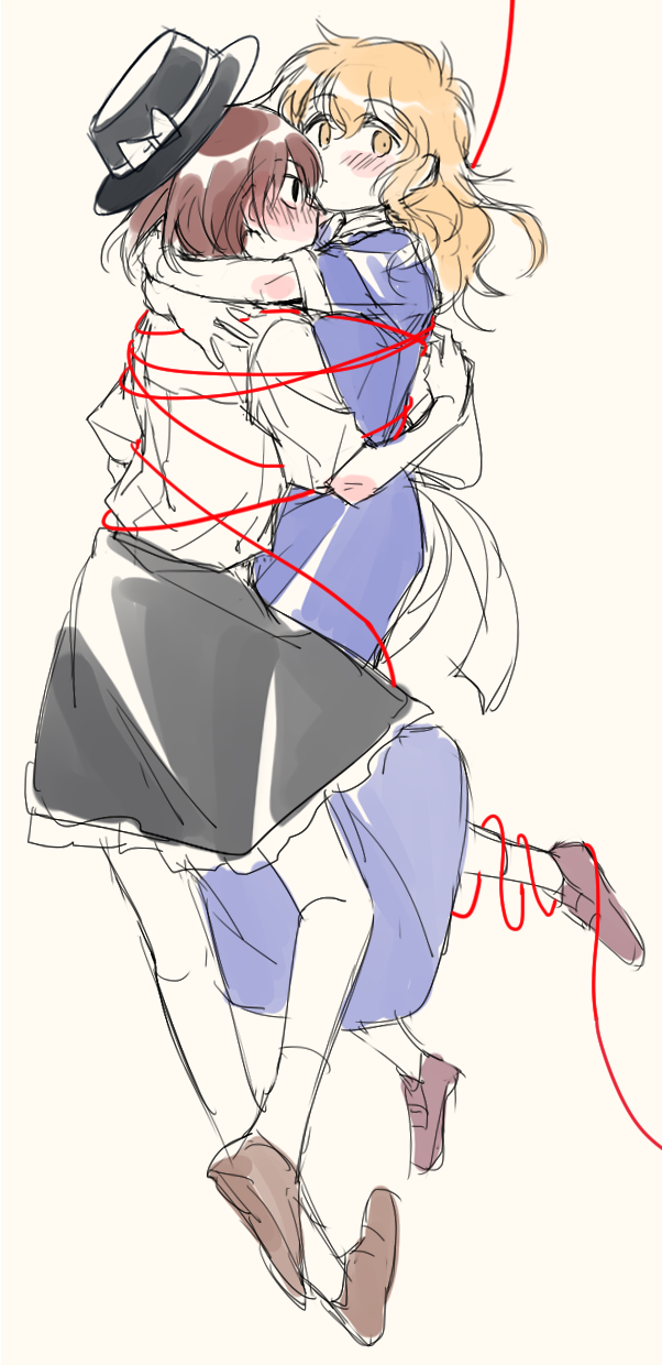 2girls back_bow black_hat black_skirt blonde_hair blush bow brown_hair brown_shoes collared_dress collared_shirt commentary_request contrast_collar dress frilled_skirt frills hat hat_bow highres long_dress long_hair maribel_hearn missing_headwear multiple_girls purple_dress re_ghotion shirt shirt_tucked_in shoes short_hair simple_background skirt socks string string_of_fate touhou usami_renko white_background white_bow white_shirt white_socks yellow_eyes