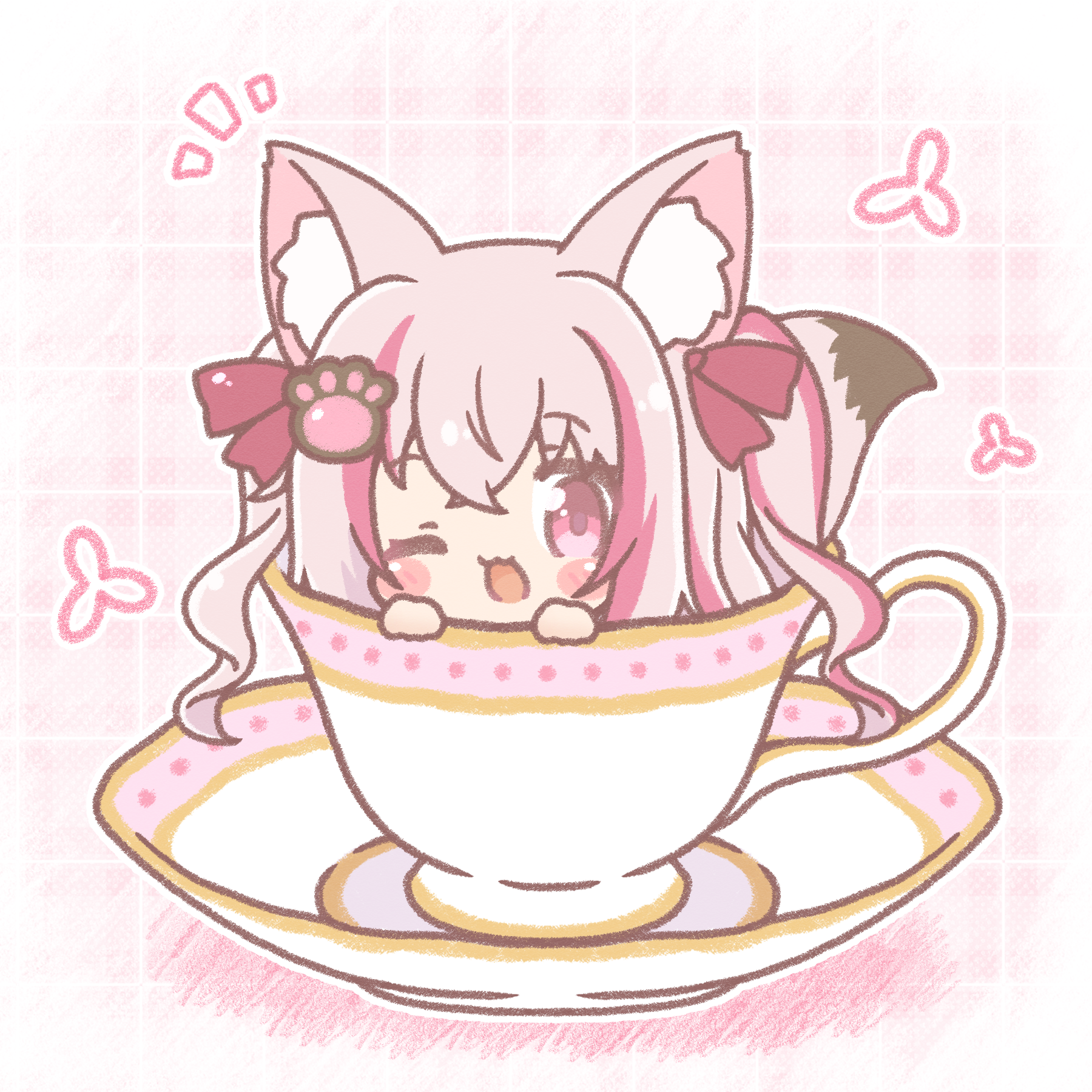1girl ;d animal_ear_fluff animal_ears chibi colored_shadow commentary_request cup hair_between_eyes hair_ornament hands_up highres in_container in_cup indie_virtual_youtuber long_hair looking_at_viewer mitarashi_neko multicolored_hair notice_lines one_eye_closed ookami_kuon open_mouth paw_hair_ornament pink_hair purple_eyes purple_hair saucer shadow smile solo streaked_hair tail teacup two_side_up virtual_youtuber