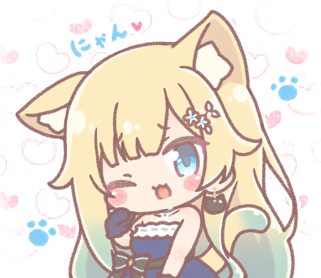 1girl ;d aizawa_ema bare_shoulders black_bow blonde_hair blue_dress blue_eyes blue_gloves blush_stickers bow chibi dress flower gloves gradient_hair green_hair hair_flower hair_ornament hand_up heart heart_background long_hair looking_at_viewer mitarashi_neko multicolored_hair one_eye_closed open_mouth paw_pose ribbon-trimmed_dress ribbon_trim smile solo translation_request very_long_hair virtual_youtuber vspo! white_background white_flower