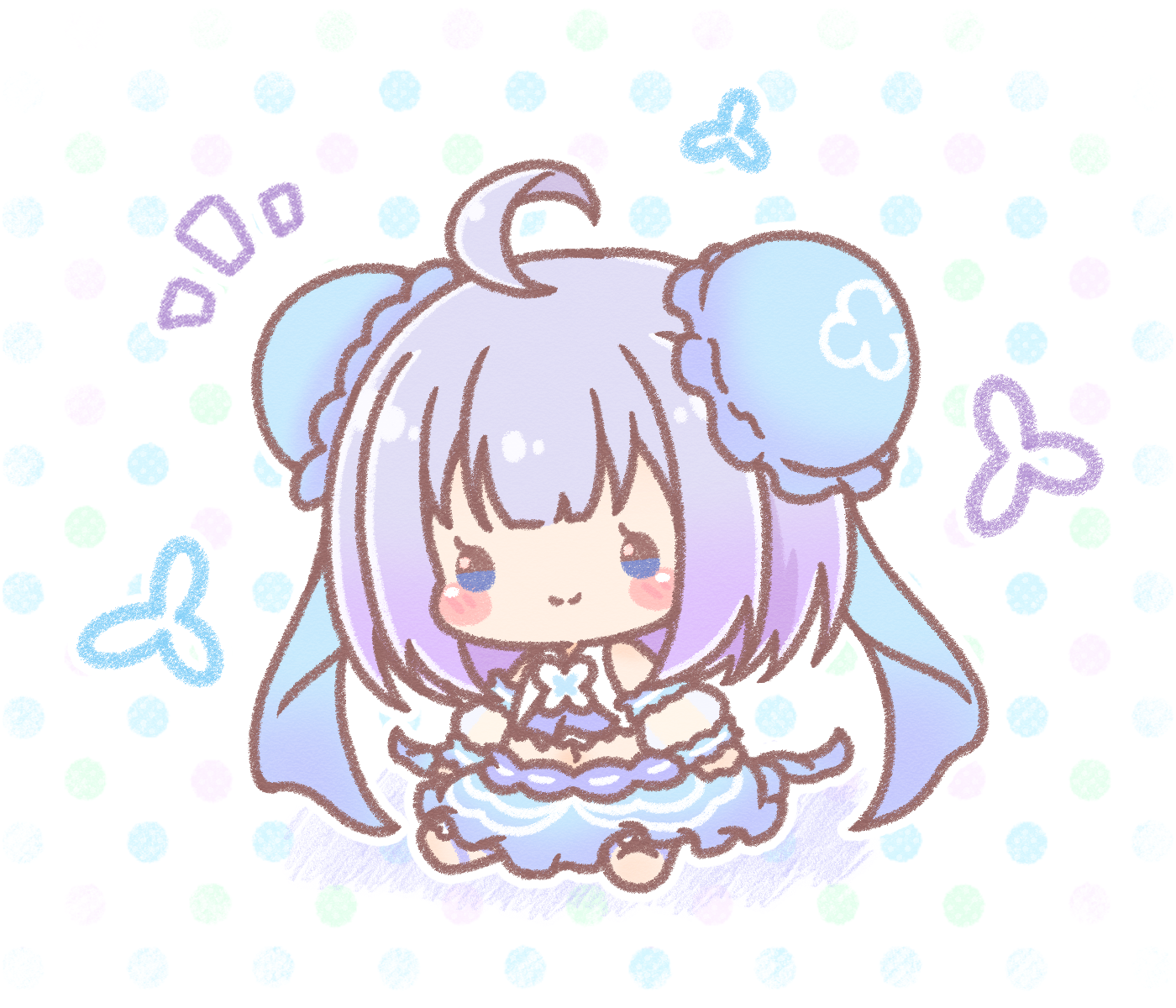1girl ahoge barefoot blue_eyes blue_skirt blush_stickers bun_cover chibi closed_mouth colored_shadow commentary_request detached_sleeves double_bun hair_bun highres mitarashi_neko multicolored_polka_dots navel notice_lines polka_dot polka_dot_background propro_production puffy_short_sleeves puffy_sleeves purple_hair shadow short_sleeves sitting skirt smile solo umituki_yuru virtual_youtuber white_background
