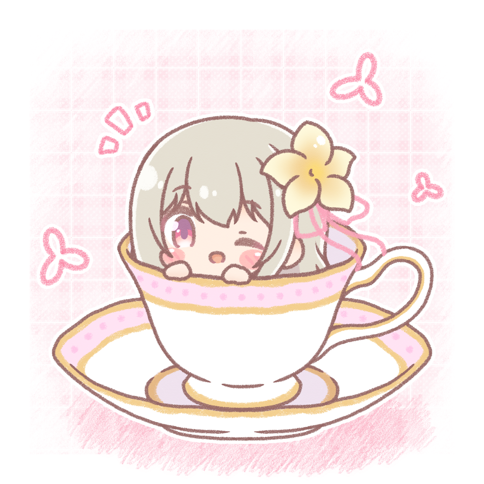 1girl ;d brown_flower brown_hair chibi colored_shadow commentary_request cup flower hair_flower hair_ornament hanakumo_rin_(vtuber) hands_up highres in_container in_cup long_hair looking_at_viewer mitarashi_neko notice_lines one_eye_closed open_mouth pink_ribbon propro_production red_eyes ribbon saucer shadow smile solo teacup virtual_youtuber