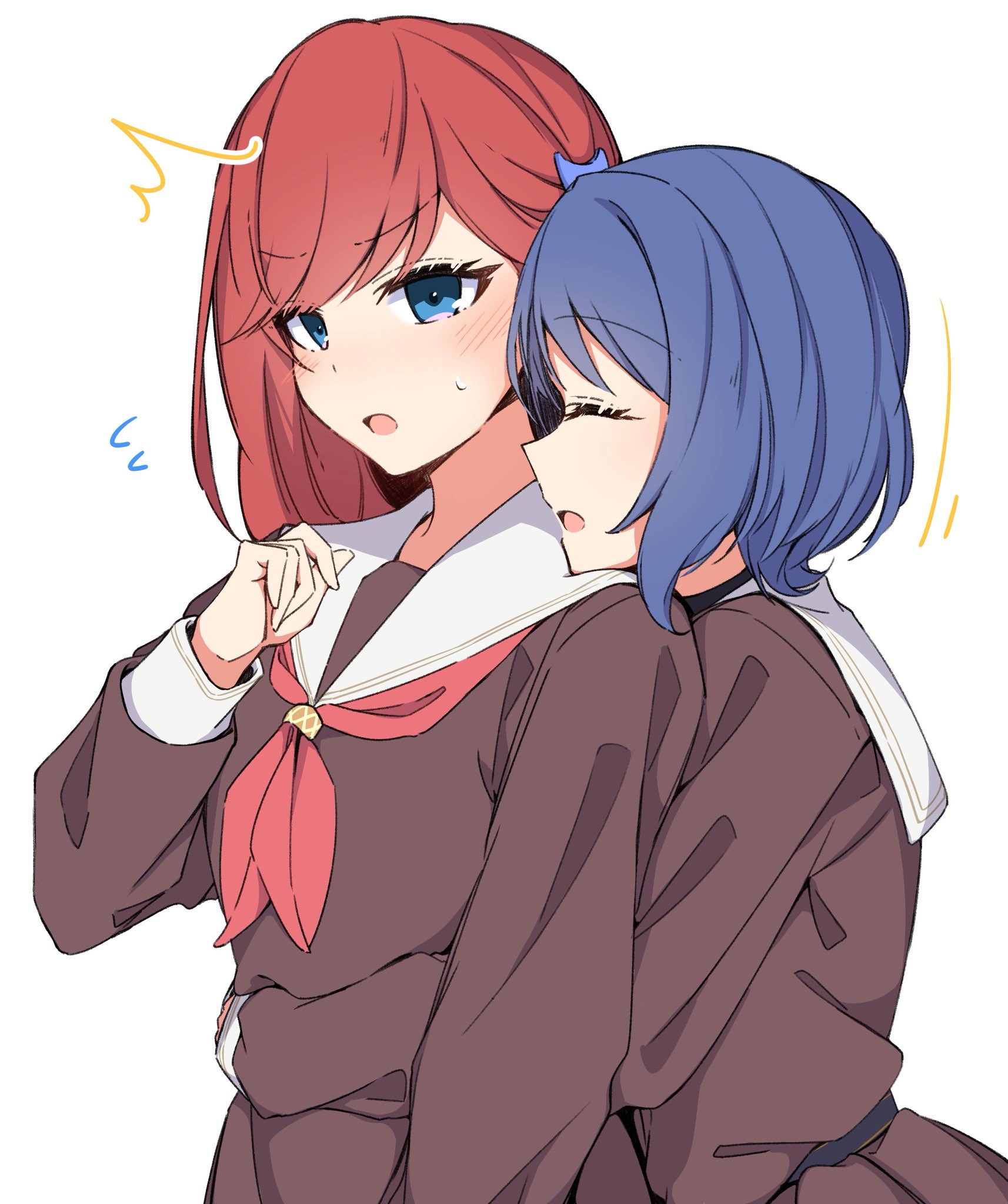 2girls ^^^ amano_mitara blue_eyes blue_hair blush brown_dress closed_eyes commentary dress flying_sweatdrops hasu_no_sora_school_uniform highres hug hug_from_behind kinjou_maika link!_like!_love_live! long_hair long_sleeves love_live! medium_hair multiple_girls neckerchief open_mouth red_hair red_neckerchief reizawa_aoi sailor_collar sailor_dress school_uniform simple_background smile sweatdrop undershirt virtual_youtuber white_background white_sailor_collar winter_uniform