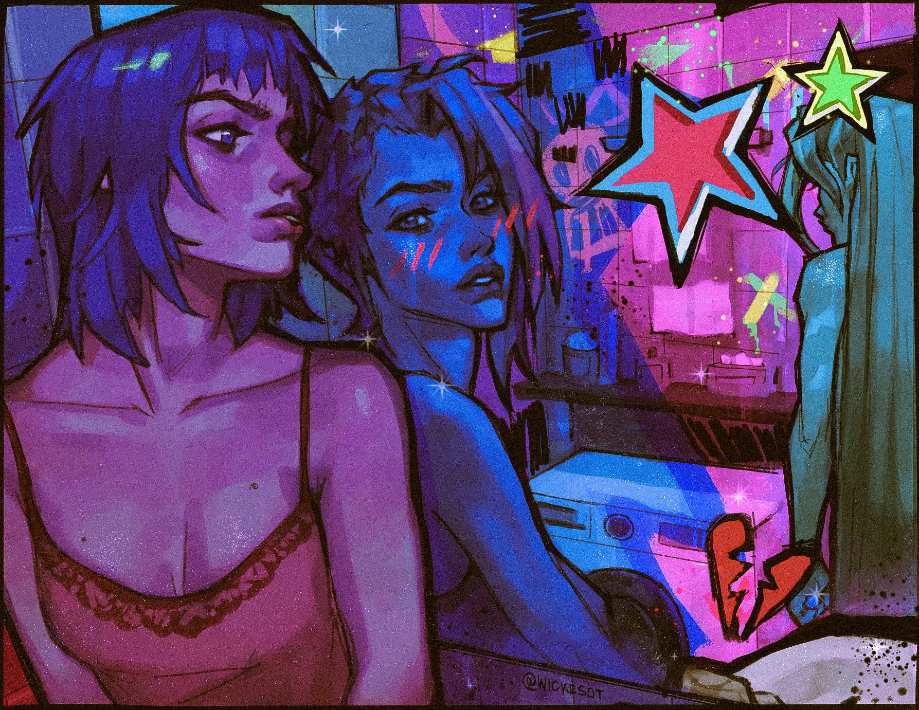 3girls arcane:_league_of_legends blue_eyes blue_hair breasts broken_heart camisole cleavage commentary different_reflection english_commentary hair_down heart highres jinx_(league_of_legends) league_of_legends lips long_hair medium_hair mirror multiple_girls multiple_persona parted_lips powder_(alternate_timeline)_(arcane) red_camisole reflection small_breasts spaghetti_strap star_(symbol) very_long_hair washing_machine wickesdt